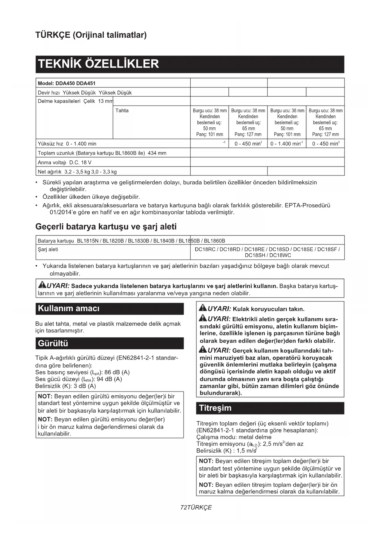 - Ağırlık,ekliaksesuara/aksesuarlaravebataryakartuşunabağlıolarakfarklılıkgösterebilir.EPTA-Prosedürü 01/2014’egöreenhafifveenağırkombinasyonlartablodaverilmiştir. Geçerli batarya kartuşu ve şarj aleti Bataryakartuşu BL1815N / BL1820B / BL1830B / BL1840B / BL1850B / BL1860B Şarjaleti DC18RC / DC18RD / DC18RE / DC18SD / DC18SE / DC18SF / DC18SH / DC18WC