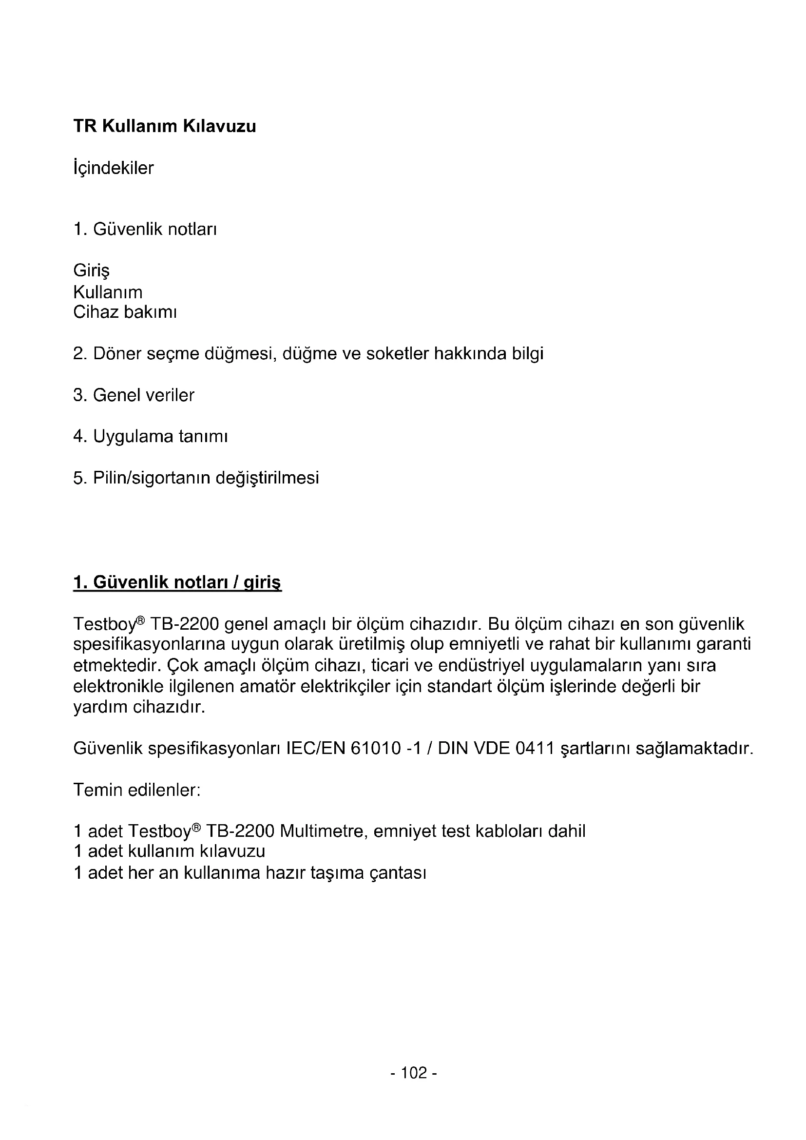 Testboy® TB-2200, teknik açidan emniyetli ve kusursuz olarak fabrikamizdan Çıkar. Cihazın bu kosullarda kalması salıkak,—in, kullanı,—in bu kilavuzda yer alan emniyet notlarina uyması gerekir.