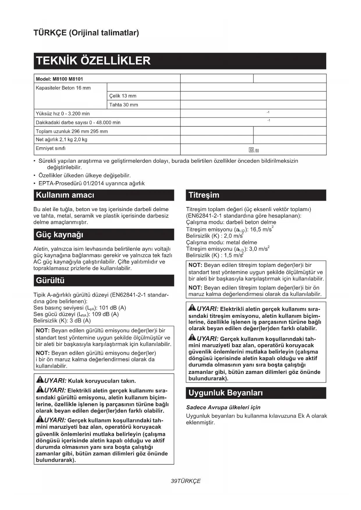 - EPTA-Prosedürü 01/2014 uyarınca ağırlık Kullanım amacı Bu alet ile tuğla, beton ve taş içerisinde darbeli delme ve tahta, metal, seramik ve plastik içerisinde darbesiz delme amaçlanmıştır. Güç kaynağı Aletin, yalnızca isim levhasında belirtilenle aynı voltajlı güç kaynağına bağlanması gerekir ve yalnızca tek fazlı AC güç kaynağıyla çalıştırılabilir. Çifte yalıtımlıdır ve topraklamasız prizlerle de kullanılabilir. Gürültü Tipik A-ağırlıklı gürültü düzeyi (EN62841-2-1 standar- dına göre belirlenen): Ses basınç seviyesi (L