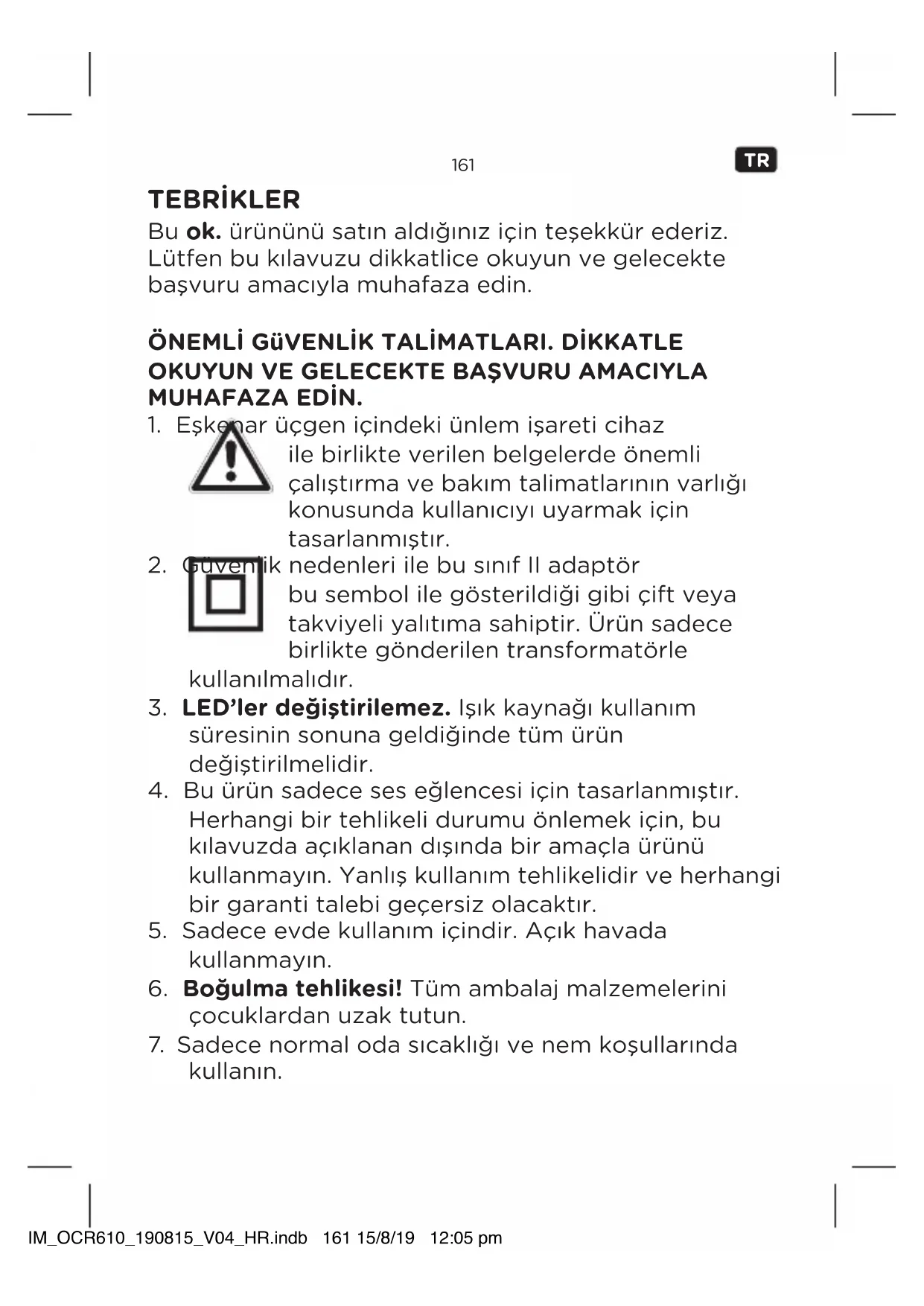 İMHA ETME Bu cihazı evsel atık olarak imha etmeyin. Cihazı, elektrikli veelektronik ekipmanlar için kurulan geri dönüştürme ya da toplama noktalarına teslim edin. Daha fazla bilgi almak için satıcınıza veya yerel mercilere danışın. Lütfen pilleri çevreye duyarlı şekilde bertaraf edin. Pilleri evsel atıklarla birlikte atmayın. Lütfen bölgenizde bulunan geri dönüşüm ve toplama sistemlerini kullanın veya ürünü satın aldığınız satıcıya danışın. IM_OCR610_190815_V04_HR.indb 174 15/8/19 12:05 pm