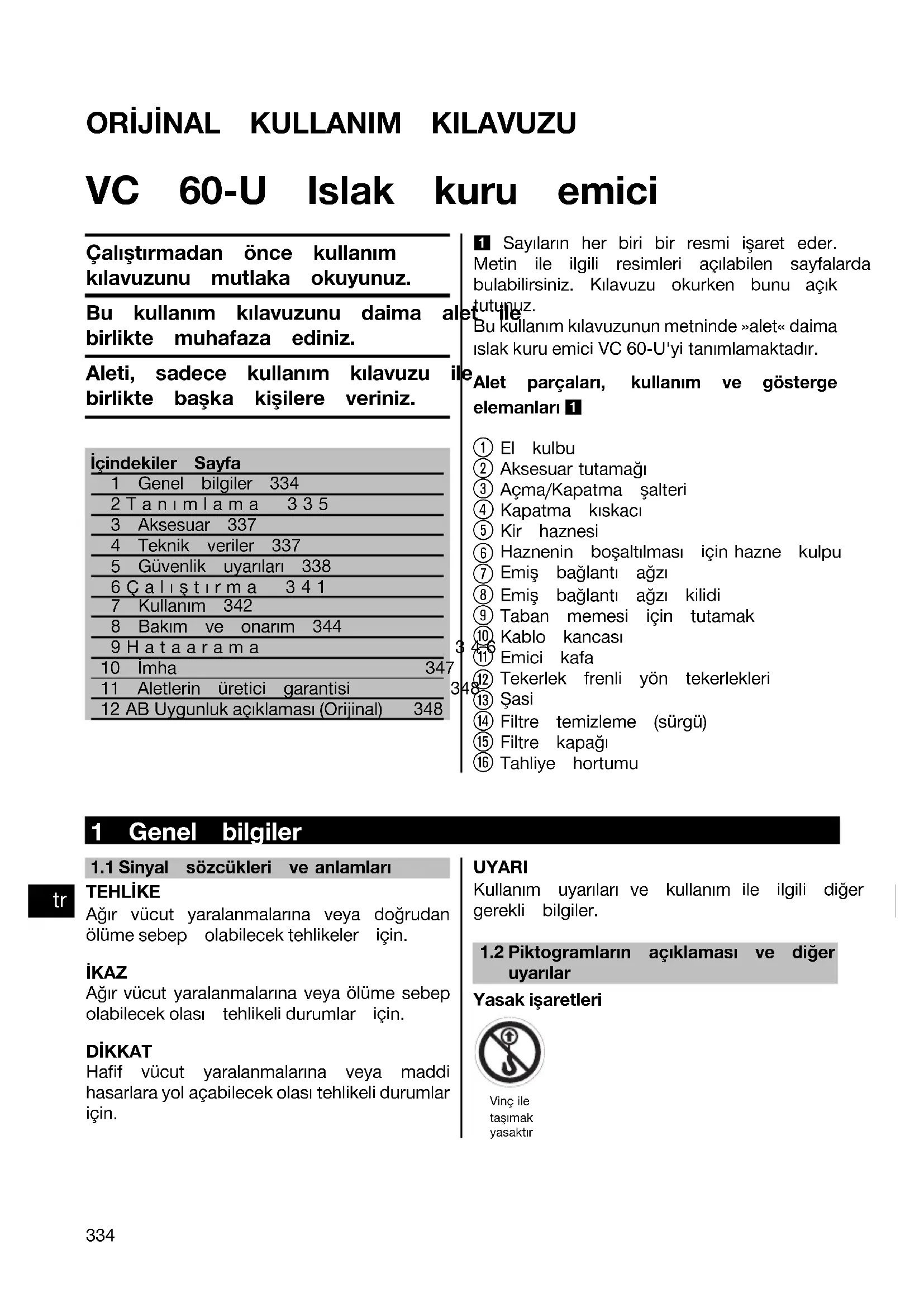 Printed: 05.12.2013 | Doc-Nr: PUB / 5071295 / 000 / 02ORİJİNAL KULLANIM KILAVUZU VC 60‑U Islak kuru emici Çalıştırmadan önce kullanımkılavuzunu mutlaka okuyunuz.Bu kullanım kılavuzunu daima alet ilebirlikte muhafaza ediniz.Aleti, sadece kullanım kılavuzu ilebirlikte başka kişilere veriniz.İçindekiler Sayfa1 Genel bilgiler 3342Tanımlama 3353 Aksesuar 3374 Teknik veriler 3375 Güvenlik uyarıları 3386Çalıştırma 3417 Kullanım 3428 Bakım ve onarım 3449Hataarama 34610 İmha 34711 Aletlerin üretici garantisi 348 12 AB Uygunluk açıklaması (Orijinal) 348 1 Sayıların her biri bir resmi işaret eder. Metin ile ilgili resimleri açılabilen sayfalarda bulabilirsiniz. Kılavuzu okurken bunu açık tutunuz. Bu kullanım kılavuzunun metninde »alet« daima ıslak kuru emici VC 60‑U'yi tanımlamaktadır. Alet parçaları, kullanım ve gösterge elemanları 1 El kulbu Aksesuar tutamağı Açma/Kapatma şalteri Kapatma kıskacı Kir haznesi Haznenin boşaltılması için hazne kulpu Emiş bağlantı ağzı Emiş bağlantı ağzı kilidi Taban memesi için tutamak Kablo kancası Emici kafa Tekerlek frenli yön tekerlekleri