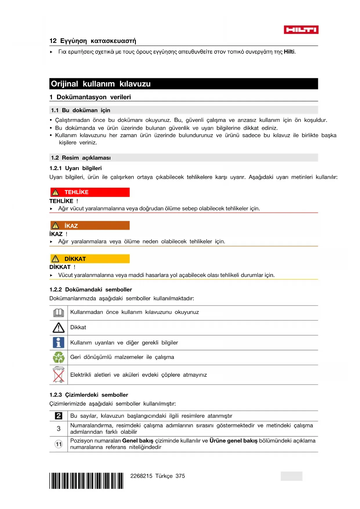 - Sayfa 385. 11 İmha Hilti ürünleri yüksek oranda tekrar kullanılabilen malzemelerden üretilmiştir. Tekrar kullanım için gerekli koşul, usulüne uygun malzeme ayrımıdır. Çoğu ülkede Hilti eski aletlerini yeniden değerlendirmek üzere geri alır. Bu konuda Hilti müşteri hizmetlerinden veya satış temsilcinizden bilgi alabilirsiniz. Kullanılmış elektronik ve elektrikli el aletlerine ilişkin Avrupa Direktifi ve ulusal yasalardaki uyarlamalar çerçevesinde, kullanılmış elektrikli el aletleri ayrı olarak toplanmalı ve çevreye zarar vermeden yeniden değerlendirilmeleri sağlanmalıdır.