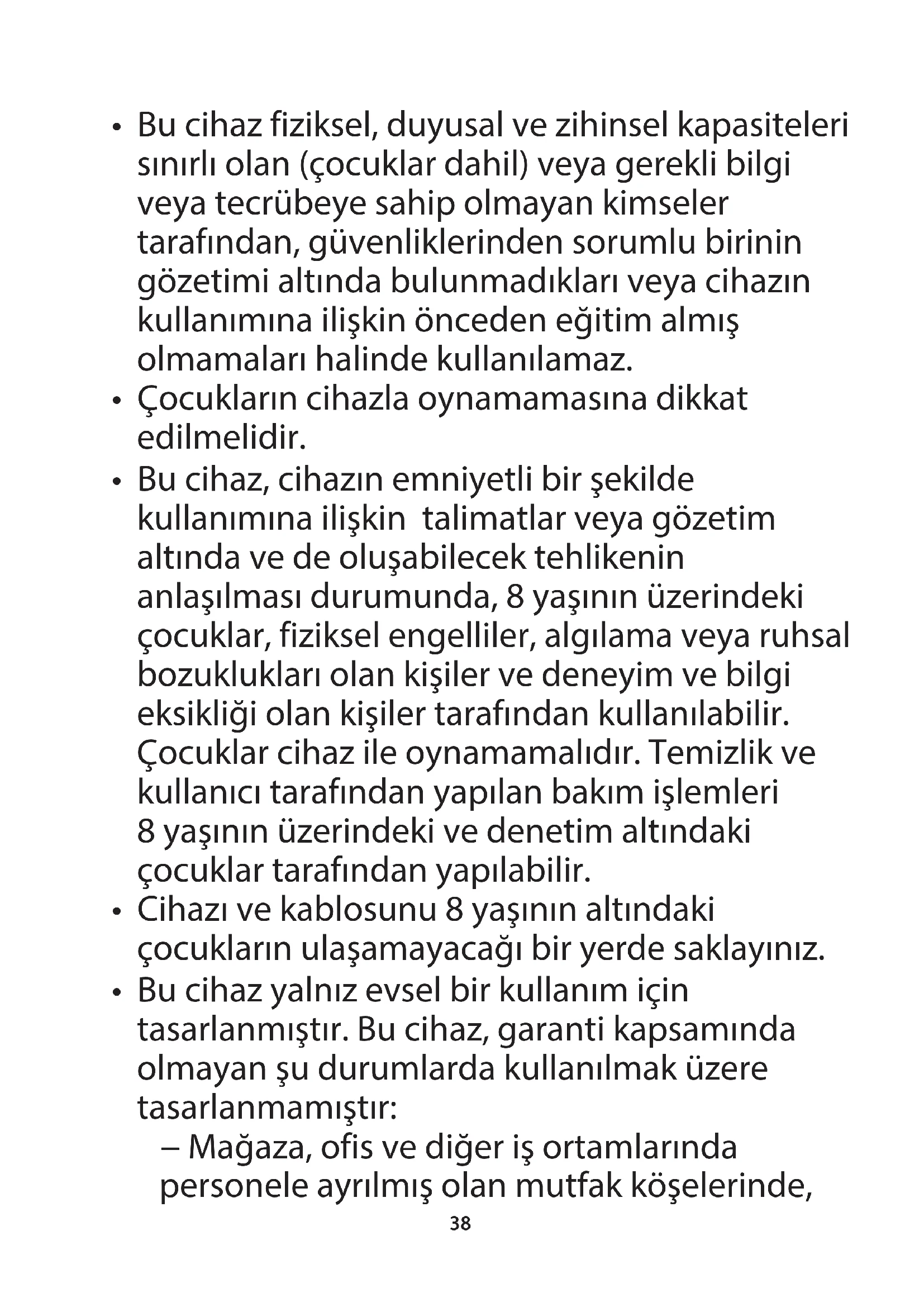 - Bu cihaz fiziksel, duyusal ve zihinsel kapasiteleri sınırlı olan (çocuklar dahil) veya gerekli bilgi veya tecrübeye sahip olmayan kimseler tarafından, güvenliklerinden sorumlu birinin gözetimi altında bulunmadıkları veya cihazın kullanımına ilişkin önceden eğitim almış olmamaları halinde kullanılamaz.