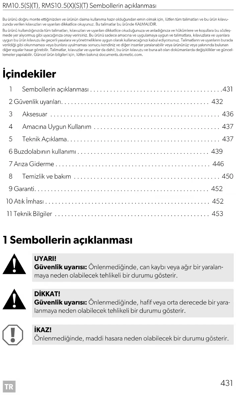 UYARI! Güvenlik uyarısı: Önlenmediğinde, can kaybı veya ağır bir yaralan- maya neden olabilecek tehlikeli bir durumu gösterir. DİKKAT! Güvenlik uyarısı: Önlenmediğinde, hafif veya orta derecede bir yara- lanmaya neden olabilecek tehlikeli bir durumu gösterir. İKAZ! Önlenmediğinde, maddi hasara neden olabilecek bir durumu gösterir.TR Güvenlik uyarıları RM10.5(S)(T), RMS10.5(X)(S)(T)