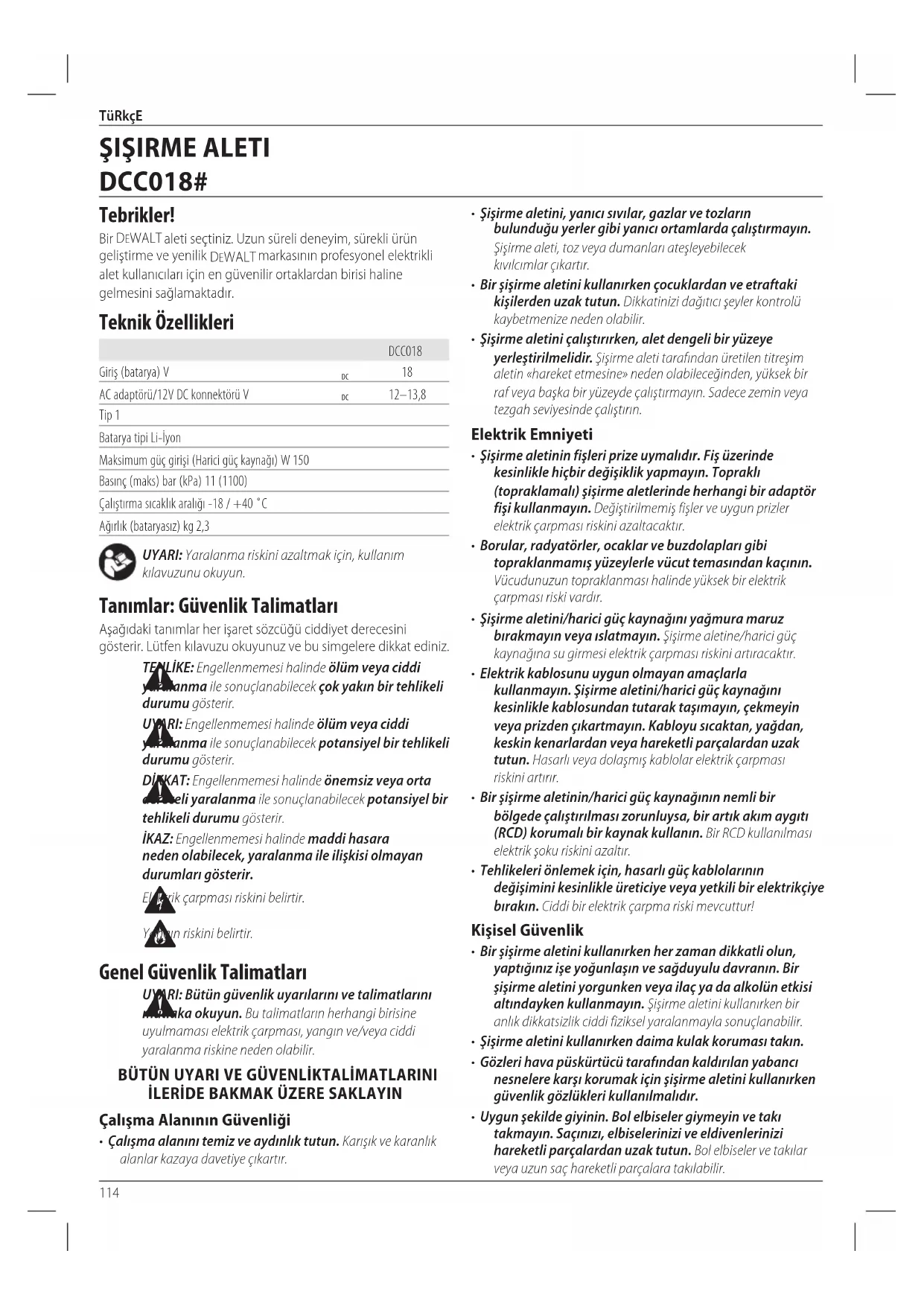 - Uygun şekilde giyinin. Bol elbiseler giymeyin ve takı takmayın. Saçınızı, elbiselerinizi ve eldivenlerinizi hareketli parçalardan uzak tutun. Bol elbiseler ve takılar veya uzun saç hareketli parçalaratakılabilir. Tebrikler! Bir DeWALT aleti seçtiniz. Uzun süreli deneyim, sürekli ürün geliştirme ve yenilik DeWALT markasının profesyonel elektrikli alet kullanıcıları için en güvenilir ortaklardan birisi haline gelmesinisağlamaktadır. Teknik Özellikleri DCC018 Giriş (batarya) V