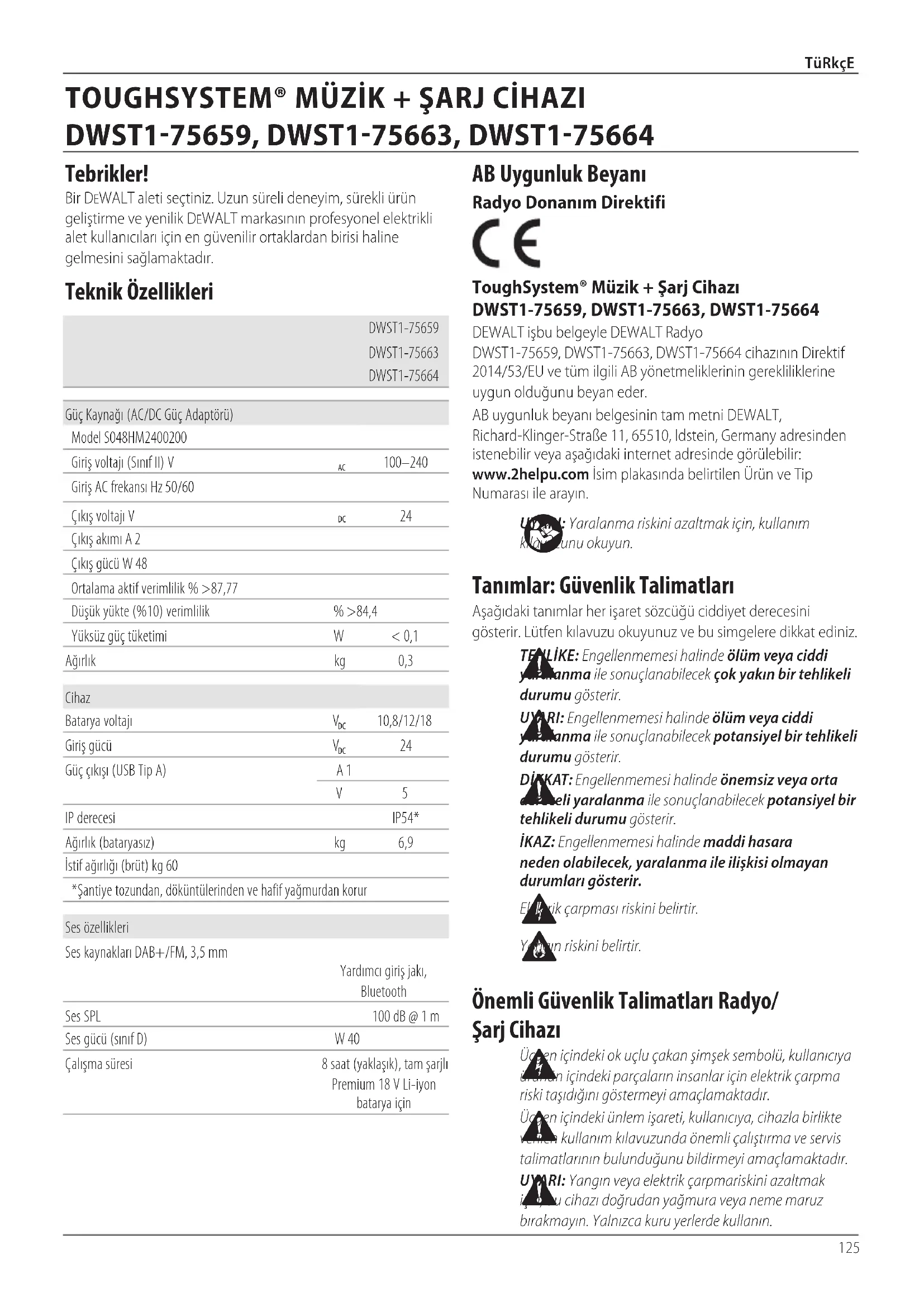 DEWALT işbu belgeyle DEWALT Radyo DWST1-75659, DWST1-75663, DWST1-75664 cihazının Direktif 2014/53/EU ve tüm ilgili AB yönetmeliklerinin gerekliliklerine uygun olduğunu beyaneder.AB uygunluk beyanı belgesinin tam metni DEWALT, Richard-Klinger-Straße 11, 65510, Idstein, Germany adresinden istenebilir veya aşağıdaki internet adresinde görülebilir: www.2helpu.com İsim plakasında belirtilen Ürün ve Tip Numarası ilearayın.DWST1-75659DWST1-75663DWST1-75664Güç Kaynağı (AC/DC Güç Adaptörü)Model S048HM2400200Giriş voltajı (Sınıf II) V 100–240Giriş AC frekansı Hz 50/60Çıkış voltajı V