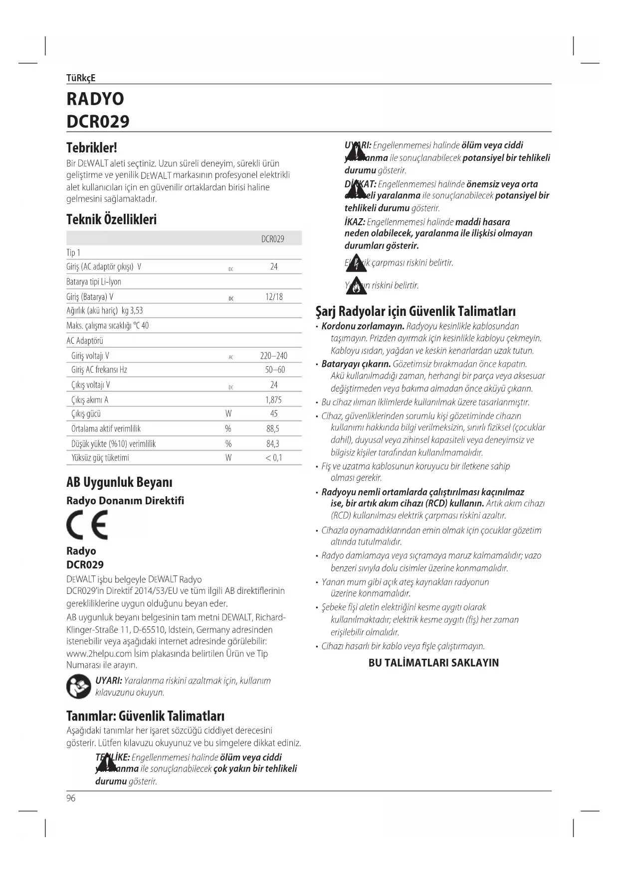 Ortalama aktif verimlilik % 88,5 Düşük yükte (%10) verimlilik % 84,3 Yüksüz güç tüketimi W < 0,1 AB Uygunluk Beyanı Radyo Donanım Direktifi Radyo DCR029 DeWALT işbu belgeyle DeWALT Radyo DCR029’in Direktif 2014/53/EU ve tüm ilgili AB direktiflerinin gerekliliklerine uygun olduğunu beyaneder. AB uygunluk beyanı belgesinin tam metni DEWALT, Richard- Klinger-Straße 11, D-65510, Idstein, Germany adresinden istenebilir veya aşağıdaki internet adresinde görülebilir: www.2helpu.com İsim plakasında belirtilen Ürün ve Tip Numarası ilearayın. UYARI: Yaralanma riskini azaltmak için, kullanım kılavuzunuokuyun. Tanımlar: Güvenlik Talimatları Aşağıdaki tanımlar her işaret sözcüğü ciddiyet derecesini gösterir. Lütfen kılavuzu okuyunuz ve bu simgelere dikkatediniz.