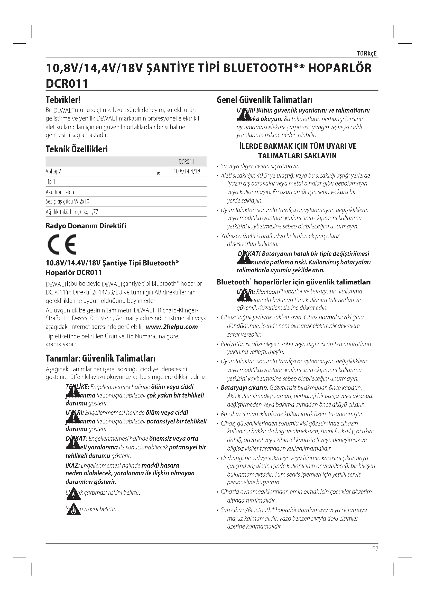10,8/14,4/18 Tip 1 Akü tipi Li-Ion Ses çıkış gücü W 2x10 Ağırlık (akü hariç) kg 1,77 Radyo Donanım Direktifi 10.8V/14.4V/18V Şantiye Tipi Bluetooth® Hoparlör DCR011 DeWALT işbu belgeyle DeWALT şantiye tipi Bluetooth® hoparlör DCR011’in Direktif 2014/53/EU ve tüm ilgili AB direktiflerinin gerekliliklerine uygun olduğunu beyaneder. AB uygunluk belgesinin tam metni DeWALT , Richard-Klinger- Straße 11, D-65510, Idstein, Germany adresinden istenebilir veya aşağıdaki internet adresinde görülebilir: www.2helpu.com Tip etiketinde belirtilen Ürün ve Tip Numarasına göre aramayapın. Tanımlar: Güvenlik Talimatları Aşağıdaki tanımlar her işaret sözcüğü ciddiyet derecesini gösterir. Lütfen kılavuzu okuyunuz ve bu simgelere dikkatediniz.