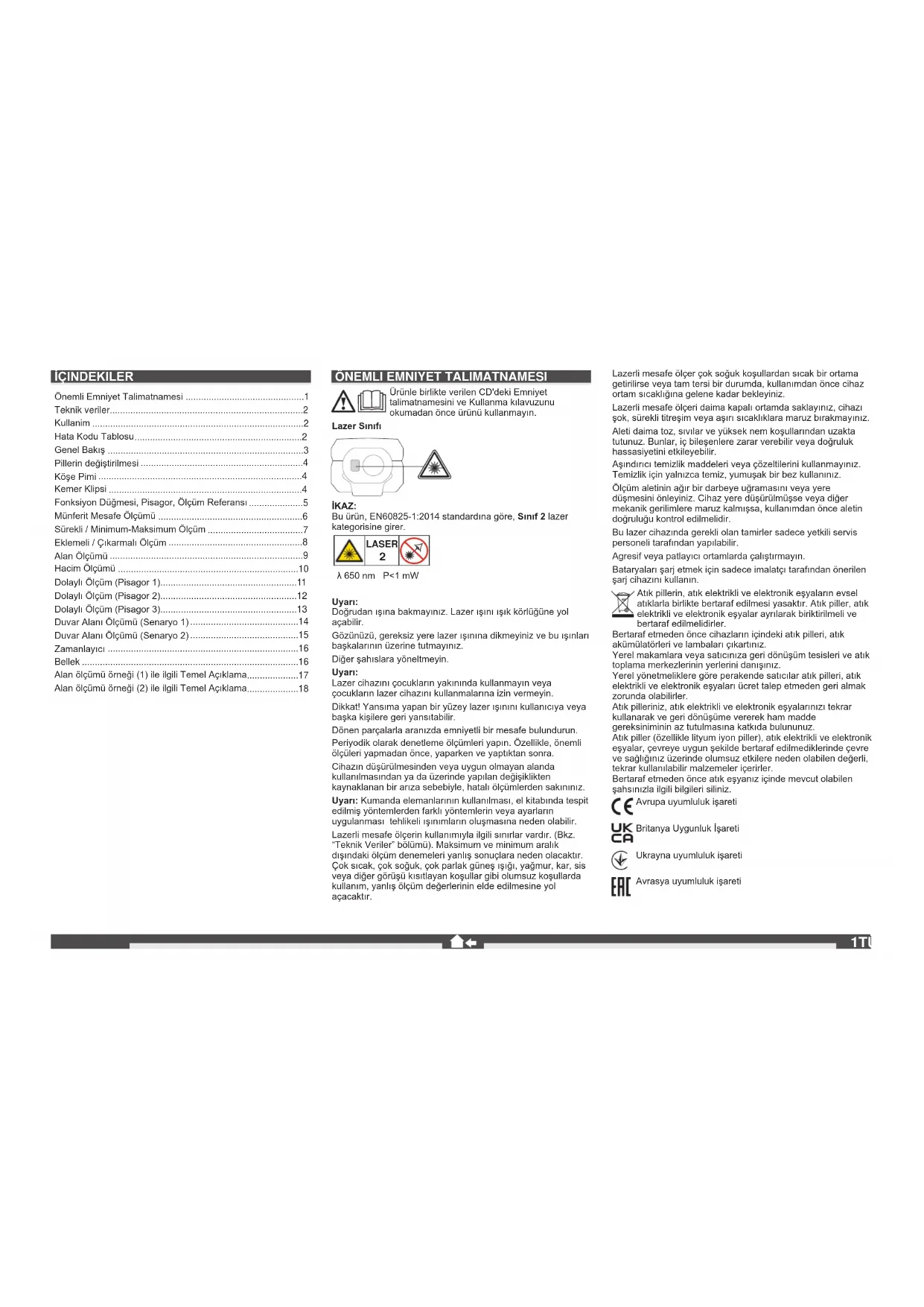 λ 650 nm P<1 mW Uyarı: Doğrudan ışına bakmayınız. Lazer ışını ışık körlüğüne yol açabilir. Gözünüzü, gereksiz yere lazer ışınına dikmeyiniz ve bu ışınları başkalarının üzerine tutmayınız. Diğer şahıslara yöneltmeyin. Uyarı: Lazer cihazını çocukların yakınında kullanmayın veya çocukların lazer cihazını kullanmalarına izin vermeyin. Dikkat! Yansıma yapan bir yüzey lazer ışınını kullanıcıya veya başka kişilere geri yansıtabilir. Dönen parçalarla aranızda emniyetli bir mesafe bulundurun. Periyodik olarak denetleme ölçümleri yapın. Özellikle, önemli ölçüleri yapmadan önce, yaparken ve yaptıktan sonra. Cihazın düşürülmesinden veya uygun olmayan alanda kullanılmasından ya da üzerinde yapılan değişiklikten kaynaklanan bir arıza sebebiyle, hatalı ölçümlerden sakınınız. Uyarı: Kumanda elemanlarının kullanılması, el kitabında tespit edilmiş yöntemlerden farklı yöntemlerin veya ayarların uygulanması tehlikeli ışınımların oluşmasına neden olabilir. Lazerli mesafe ölçerin kullanımıyla ilgili sınırlar vardır. (Bkz. “Teknik Veriler” bölümü). Maksimum ve minimum aralık dışındaki ölçüm denemeleri yanlış sonuçlara neden olacaktır. Çok sıcak, çok soğuk, çok parlak güneş ışığı, yağmur, kar, sis veya diğer görüşü kısıtlayan koşullar gibi olumsuz koşullarda kullanım, yanlış ölçüm değerlerinin elde edilmesine yol açacaktır. Lazerli mesafe ölçer çok soğuk koşullardan sıcak bir ortama getirilirse veya tam tersi bir durumda, kullanımdan önce cihaz ortam sıcaklığına gelene kadar bekleyiniz. Lazerli mesafe ölçeri daima kapalı ortamda saklayınız, cihazı şok, sürekli titreşim veya aşırı sıcaklıklara maruz bırakmayınız. Aleti daima toz, sıvılar ve yüksek nem koşullarından uzakta tutunuz. Bunlar, iç bileşenlere zarar verebilir veya doğruluk hassasiyetini etkileyebilir. Aşındırıcı temizlik maddeleri veya çözeltilerini kullanmayınız. Temizlik için yalnızca temiz, yumuşak bir bez kullanınız. Ölçüm aletinin ağır bir darbeye uğramasını veya yere düşmesini önleyiniz. Cihaz yere düşürülmüşse veya diğer mekanik gerilimlere maruz kalmışsa, kullanımdan önce aletin doğruluğu kontrol edilmelidir. Bu lazer cihazında gerekli olan tamirler sadece yetkili servis personeli tarafından yapılabilir. Agresif veya patlayıcı ortamlarda çalıştırmayın. Bataryaları şarj etmek için sadece imalatçı tarafından önerilen şarj cihazını kullanın. Atık pillerin, atık elektrikli ve elektronik eşyaların evsel atıklarla birlikte bertaraf edilmesi yasaktır. Atık piller, atık elektrikli ve elektronik eşyalar ayrılarak biriktirilmeli ve bertaraf edilmelidirler. Bertaraf etmeden önce cihazların içindeki atık pilleri, atık akümülatörleri ve lambaları çıkartınız. Yerel makamlara veya satıcınıza geri dönüşüm tesisleri ve atık toplama merkezlerinin yerlerini danışınız. Yerel yönetmeliklere göre perakende satıcılar atık pilleri, atık elektrikli ve elektronik eşyaları ücret talep etmeden geri almak zorunda olabilirler. Atık pilleriniz, atık elektrikli ve elektronik eşyalarınızı tekrar kullanarak ve geri dönüşüme vererek ham madde gereksiniminin az tutulmasına katkıda bulununuz. Atık piller (özellikle lityum iyon piller), atık elektrikli ve elektronik eşyalar, çevreye uygun şekilde bertaraf edilmediklerinde çevre ve sağlığınız üzerinde olumsuz etkilere neden olabilen değerli, tekrar kullanılabilir malzemeler içerirler. Bertaraf etmeden önce atık eşyanız içinde mevcut olabilen şahsınızla ilgili bilgileri siliniz. Avrupa uyumluluk işareti Britanya Uygunluk İşareti Ukrayna uyumluluk işareti Avrasya uyumluluk işareti İÇINDEKILER Önemli Emniyet Talimatnamesi ..............................................1 Teknik veriler...........................................................................2 Kullanim