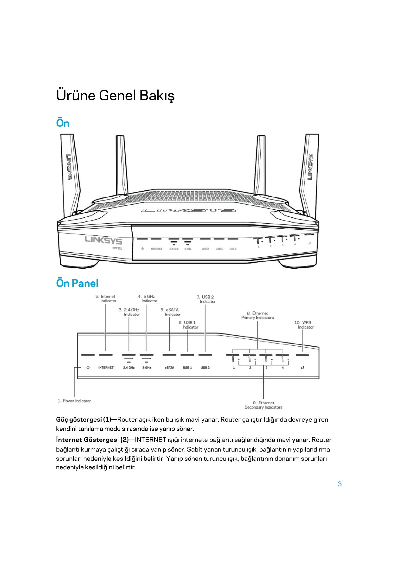 Ön Panel Güç göstergesi (1)—Router açık iken bu ışık mavi yanar. Router çalıştırıldığında devreye giren kendini tanılama modu sırasında ise yanıp söner. İnternet Göstergesi (2)—INTERNET ışığı internete bağlantı sağlandığında mavi yanar. Router bağlantı kurmaya çalıştığı sırada yanıp söner. Sabit yanan turuncu ışık, bağlantının yapılandırma sorunları nedeniyle kesildiğini belirtir. Yanıp sönen turuncu ışık, bağlantının donanım sorunları nedeniyle kesildiğini belirtir.4 2,4 GHz Göstergesi (3)—2,4 GHz ağa bağlı olan bir veya birkaç istemci varsa, bu ışık mavi yanar. Router 2,4 GHz ağı üzerinden aktif olarak veri gönderirken veya alırken ışık yanıp söner. 5 GHz Göstergesi (4)—5 GHz ağa bağlı olan bir veya birkaç istemci varsa, bu ışık mavi yanar. Router 5 GHz ağı üzerinden aktif olarak veri gönderirken veya alırken ışık yanıp söner. eSATA Göstergesi (5)—Işık yanmıyorsa USB/eSATA portu kapalıdır veya bir USB cihaz bağlıdır. Bir eSATA cihaz bağlı olduğunda, ışık mavi yanar. eSATA portu üzerinden veri alışverişi varsa yanıp söner. USB1 Göstergesi (6)—Işık yanmıyorsa USB/eSATA portu kapalıdır veya bir eSATA cihaz bağlıdır. Bir USB cihaz bağlı olduğunda, ışık mavi yanar. Port üzerinden veri alışverişi varsa yanıp söner. USB2 Göstergesi (7)—Bir USB cihaz bağlı olduğunda, ışık mavi yanar. Port üzerinden veri alışverişi varsa yanıp söner. ETHERNET 1 - 4 (Birincil) (8)—(Beyaz) Bu numaralı ışıklar, router'ın arka panelindeki numaralı bağlantı noktalarına karşılık gelir. Mavi ışık sabit yanıyorsa, router bu port üzerinden bir aygıta bağlanmış demektir. Port üzerinden veri alışverişi varsa ışık yanıp söner. ETHERNET 1 - 4 (İkincil) (9)—Işık yanmıyorsa, router bu port üzerinden bir cihaza 10/100 Mbps hızda bağlanmıştır. Sabit mavi ışık yönlendiricinin cihaza 1000 Mbps hızda bağlandığını gösterir. WPS Göstergesi (10)—Wi-Fi Protected Setup sırasında ışık iki dakikaya kadar yavaşça yanıp söner. Bağlantının başarılı olduğunu göstermek için beş saniye sabit mavi yanar. Işık turuncu yanıp sönüyorsa WPS işlemi başarısız olmuştur. Bu durumda bağlanacak cihazın WPS destekleyip desteklemediğini kontrol edin. Işık sönene kadar bekleyip tekrar deneyin. Router bir kerede tek WPS oturumunu destekler.5 Arka Ayarlanabilir antenler (1)—Router çalıştırılmadan önce, dört adet ayarlanabilir harici antenin router'a bağlı olması gerekmektedir. Antenin bağlantı parçasını, router üzerindeki bağlantı noktasına saat yönünde çevirerek takın. Not: En iyi performansı almak için soldaki resimde gösterildiği gibi yan antenleri dikey olarak yerleştirin. Wi-Fi Protected Setup™ düğmesi (2)—Wi-Fi Protected Setup destekli ağ cihazlarında kablosuz bağlantı güvenliğini yapılandırmak için bu düğmeye basın. Ethernet portları (3)––Ethernet kablolarını bu mavi gigabit (10/100/1000) portlara ve ağınızdaki kablolu cihazlara bağlayın. Not: En iyi performansı almak için Ethernet portlarında CAT5e veya daha yüksek hızlı kabloları kullanın. İnternet portu (4)––Ethernet kablosunu bu sarı gigabit (10/100/1000) porta ve geniş bantlı kablo/DSL ya da fiber modeme bağlayın. Not––En iyi performansı almak için internet portunda CAT5e veya daha yüksek hızlı kabloları kullanın.6 USB 3.0 portu (5)—Bu porta bir USB disk sürücüsü bağlayarak ağınızda veya internette paylaşabilirsiniz. USB 2.0/eSATA bileşik port (6)—Bir USB veya eSATA disk sürücüsü bağlayarak ağınızda veya internette paylaşabilirsiniz. Sıfırlama düğmesi (7)––Router'ı fabrika ayarlarına sıfırlamak için güç ışığı yanıp sönmeye başlayana kadar (yaklaşık 10 saniye) basılı tutun. Adaptör girişi (8)—Kutudan çıkan adaptörü bu girişe takın. Güç anahtarı (9)—Router'ı açmak için | konumuna getirin.7 Kurulum: Genel Bilgiler Kurulumu tamamlamak için bir bilgisayar veya mobil cihaza ihtiyacınız vardır.
