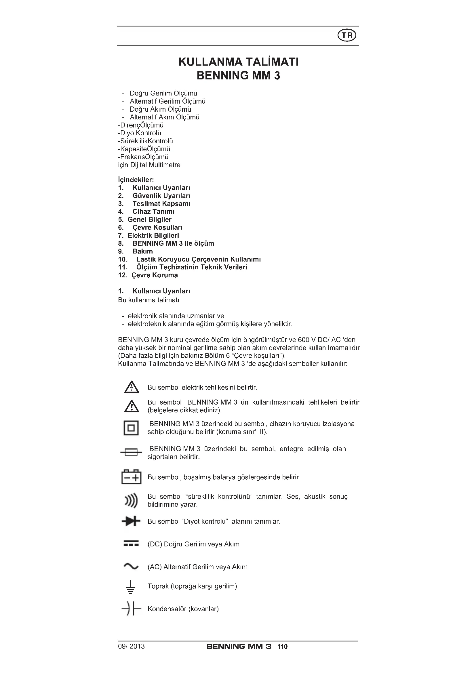 Bu kullanma talimatı - elektronik alanında uzmanlar ve - elektroteknik alanında eğitim görmüş kişilere yöneliktir. BENNING MM 3 kuru çevrede ölçüm için öngörülmüştür ve 600 V DC/ AC ‘den daha yüksek bir nominal gerilime sahip olan akım devrelerinde kullanılmamalıdır (Daha fazla bilgi için bakınız Bölüm 6 “Çevre koşulları”). Kullanma Talimatında ve BENNING MM 3 ‘de aşağıdaki semboller kullanılır: