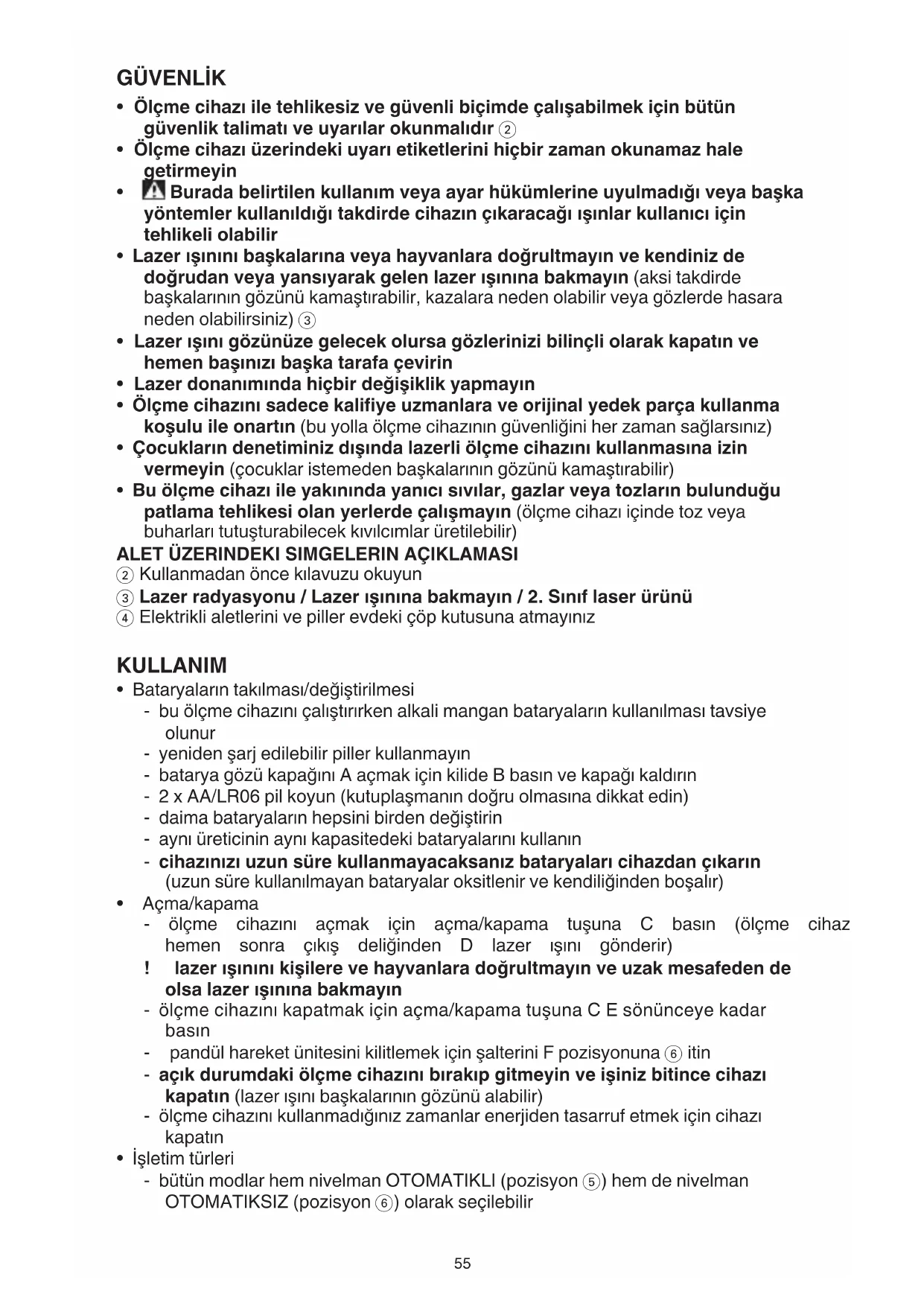 - Açma/kapama - ölçme cihazını açmak için açma/kapama tuşuna C basın (ölçme cihazı açıldıktan hemen sonra çıkış deliğinden D lazer ışını gönderir) ! lazerışınınıkişilerevehayvanlaradoğrultmayınveuzakmesafedende olsalazerışınınabakmayın - ölçme cihazını kapatmak için açma/kapama tuşuna C E sönünceye kadar basın - pandül hareket ünitesini kilitlemek için şalterini F pozisyonuna 6 itin - açıkdurumdakiölçmecihazınıbırakıpgitmeyinveişinizbitincecihazı kapatın (lazer ışını başkalarının gözünü alabilir) - ölçme cihazını kullanmadığınız zamanlar enerjiden tasarruf etmek için cihazı kapatın