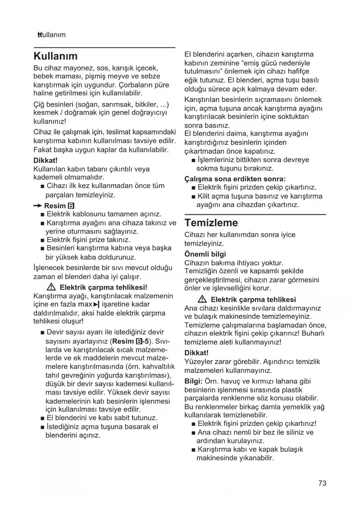 Kullanım Kullanım Bu cihaz mayonez, sos, karışık içecek, bebek maması, pişmiş meyve ve sebze karıştırmak için uygundur. Çorbaların püre haline getirilmesi için kullanılabilir. Çiğ besinleri (soğan, sarımsak, bitkiler, ...) kesmek / doğramak için genel doğrayıcıyı kullanınız! Cihaz ile çalışmak için, teslimat kapsamındaki karıştırma kabının kullanılması tavsiye edilir. Fakat başka uygun kaplar da kullanılabilir. Dikkat! Kullanılan kabın tabanı çıkıntılı veya kademeli olmamalıdır. ■ Cihazı ilk kez kullanmadan önce tüm parçaları temizleyiniz. X Resim B ■ Elektrik kablosunu tamamen açınız. ■ Karıştırma ayağını ana cihaza takınız ve yerine oturmasını sağlayınız. ■ Elektrik fişini prize takınız. ■ Besinleri karıştırma kabına veya başka bir yüksek kaba doldurunuz. İşlenecek besinlerde bir sıvı mevcut olduğu zaman el blenderi daha iyi çalışır. W Elektrik çarpma tehlikesi! Karıştırma ayağı, karıştırılacak malzemenin içine en fazla Í işaretine kadar daldırılmalıdır, aksi halde elektrik çarpma tehlikesi oluşur! ■ Devir sayısı ayarı ile istediğiniz devir sayısını ayarlayınız (Resim B-5). Sıvı- larda ve karıştırılacak sıcak malzeme- lerde ve ek maddelerin mevcut malze- melere karıştırılmasında (örn. kahvaltılık tahıl gevreğinin yoğurda karıştırılması), düşük bir devir sayısı kademesi kullanıl- ması tavsiye edilir. Yüksek devir sayısı kademelerinin katı besinlerin işlenmesi için kullanılması tavsiye edilir. ■ El blenderini ve kabı sabit tutunuz. ■ İstediğiniz açma tuşuna basarak el blenderini açınız. El blenderini açarken, cihazın karıştırma kabının zeminine “emiş gücü nedeniyle tutulmasını” önlemek için cihazı hafifçe eğik tutunuz. El blenderi, açma tuşu basılı olduğu sürece açık kalmaya devam eder. Karıştırılan besinlerin sıçramasını önlemek için, açma tuşuna ancak karıştırma ayağını karıştırılacak besinlerin içine soktuktan sonra basınız. El blenderini daima, karıştırma ayağını karıştırdığınız besinlerin içinden çıkartmadan önce kapatınız. ■ İşlemleriniz bittikten sonra devreye sokma tuşunu bırakınız. Çalışma sona erdikten sonra: ■ Elektrik fişini prizden çekip çıkartınız. ■ Kilit açma tuşuna basınız ve karıştırma ayağını ana cihazdan çıkartınız. Temizleme Cihazı her kullanımdan sonra iyice temizleyiniz. Önemli bilgi Cihazın bakıma ihtiyacı yoktur. Temizliğin özenli ve kapsamlı şekilde gerçekleştirilmesi, cihazın zarar görmesini önler ve işlevselliğini korur. W Elektrik çarpma tehlikesi Ana cihazı kesinlikle sıvılara daldırmayınız ve bulaşık makinesinde temizlemeyiniz. Temizleme çalışmalarına başlamadan önce, cihazın elektrik fişini çekip çıkarınız! Buharlı temizleme aleti kullanmayınız! Dikkat! Yüzeyler zarar görebilir. Aşındırıcı temizlik malzemeleri kullanmayınız. Bilgi: Örn. havuç ve kırmızı lahana gibi besinlerin işlenmesi sırasında plastik parçalarda renklenme söz konusu olabilir. Bu renklenmeler birkaç damla yemeklik yağ kullanılarak temizlenebilir. ■ Elektrik fişini prizden çekip çıkartınız! ■ Ana cihazı nemli bir bez ile siliniz ve ardından kurulayınız. ■ Karıştırma kabı ve kapak bulaşık makinesinde yıkanabilir.74 tr Arıza durumunda yardım ■ Karıştırma ayağı bulaşık makinesinde veya bir fırça ile akan suyun altında temizlenebilir. ■ Karıştırma ayağını dik konumda (karıştırma ayağı bıçağı yukarı doğru) kurumaya bırakarak, içine girmiş olan suyun dışarı akmasını sağlayınız. Uyarı: Spiral kablolu cihazlarda: Kabloyu kesinlikle cihazın etrafına sarmayınız! Arıza durumunda yardım Arıza Cihaz kullanım esnasında kapanıyor. Çözüm Aşırı yüklenme emniyeti devreye girmiş. ■ Cihazı kapatınız ve elektrik fişini priziden çekip çıkartınız. ■ Aşırı yüklenme emniyetini devreden çıkarmak için, cihazın yakl. 1 saat soğumasını bekleyiniz. ■ Cihazı tekrar açınız. Arıza giderilemiyorsa lütfen yetkili servise başvurunuz. Tarifler Mayonez – 1 yumurta (yumurta sarısı ve yumurta akı) – 1 çorba kaşığı hardal – 1 çorba kaşığı limon suyu veya sirke – 200-250 ml sıvı yağ – İsteğe göre tuz, karabiber Malzemeler aynı sıcaklıkta olmalıdır! ■ Malzemeleri kabın içine doldurunuz. ■ El blenderini kabın zeminine temas ettiriniz ve karışım kıvam alana kadar malzemeleri (Turbo hız ile) karıştırınız. ■ Çalışır haldeki mikseri yavaşça karışımın üst kenarına kadar kaldırınız ve tekrar indirerek mayonez hazır olana kadar çalıştırmaya devam ediniz. Yararlı bilgi: Bu tarife göre sadece yumurta sarısı ile mayonez de yapabilirsiniz. Ancak bu durumda yağ miktarının sadece yarısını kullanınız. Sebze çorbası – 300 g patates – 200 g havuç – 1 küçük kereviz – 2 domates – 1 soğan – 50 g tereyağı – 2 l su – İsteğe göre tuz, karabiber ■ Domateslerin kabuğunu soyunuz ve çekirdeklerini çıkartınız. ■ Temizlenmiş ve yıkanmış sebzeleri parçalara kesiniz ve sıcak tereyağı içinde pişiriniz. ■ Su ilave ediniz ve tuz atınız. ■ Hepsini 20-25 dakika pişmeye bırakınız. ■ Tencereyi ocaktan indiriniz. ■ El blenderi ile çorbayı tencere içinde eziniz. ■ Tuz ve karabiber ile tatlandırınız. Krep hamuru – 250 ml süt – 1 yumurta – 100 g un – 25 g eritilmiş, soğutulmuş tereyağı ■ Tüm malzemeleri belirtilen sırayla bir kap içine koyunuz ve pürüzsüz bir hamur olacak şekilde karıştırınız. Sütlü içecekler – 1 bardak süt – 6 büyük çilek veya 10 frambuaz veya 1 muz (dilimlenmiş) ■ Malzemeleri kabın içine koyunuz ve karıştırınız. ■ İsteğe göre şeker katınız. Yararlı bilgi: Sütlü içecek (milkshak