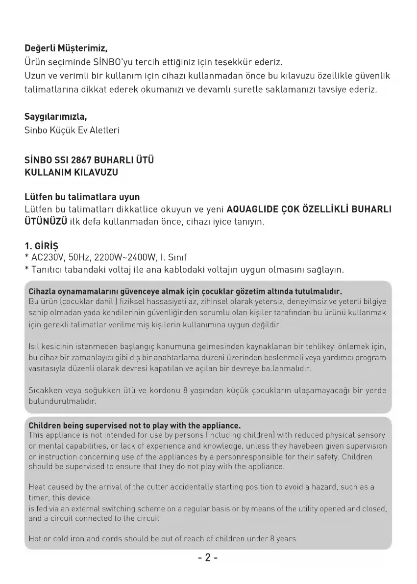 65 65- 1 -- 2 - Cihazla oynamamalarını güvenceye almak için çocuklar gözetim altında tutulmalıdır. Bu ürün (çocuklar dahil ) fiziksel hassasiyeti az, zihinsel olarak yetersiz, deneyimsiz ve yeterli bilgiye sahip olmadan yada kendilerinin güvenli¤inden sorumlu olan kifliler tarafından bu ürünü kullanmak için gerekli talimatlar verilmemifl kiflilerin kullanımına uygun de¤ildir. Isıl kesicinin istenmeden bafllangıç konumuna gelmesinden kaynaklanan bir tehlikeyi önlemek için, bu cihaz bir zamanlayıcı gibi dıfl bir anahtarlama düzeni üzerinden beslenmeli veya yardımcı program vasıtasıyla düzenli olarak devresi kapatılan ve açılan bir devreye ba.lanmalıdır. Sıcakken veya so¤ukken ütü ve kordonu 8 yaflından küçük çocukların ulaflamayaca¤ı bir yerde bulundurulmalıdır. Children being supervised not to play with the appliance. This appliance is not intended for use by persons (including children) with reduced physical,sensory or mental capabilities, or lack of experience and knowledge, unless they havebeen given supervision or instruction concerning use of the appliances by a personresponsible for their safety. Children should be supervised to ensure that they do not play with the appliance. Heat caused by the arrival of the cutter accidentally starting position to avoid a hazard, such as a timer, this device is fed via an external switching scheme on a regular basis or by means of the utility opened and closed, and a circuit connected to the circuit Hot or cold iron and cords should be out of reach of children under 8 years. De¤erli Müflterimiz, Ürün seçiminde S‹NBO'yu tercih etti¤iniz için teflekkür ederiz. Uzun ve verimli bir kullan›m için cihaz› kullanmadan önce bu k›lavuzu özellikle güvenlik talimatlar›na dikkat ederek okuman›z› ve devaml› suretle saklaman›z› tavsiye ederiz. Sayg›lar›m›zla, Sinbo Küçük Ev Aletleri