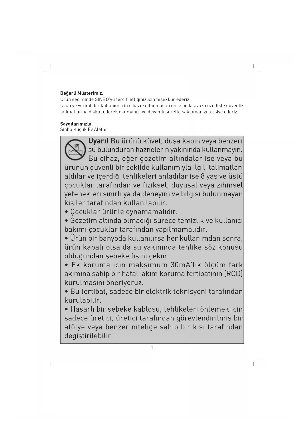 www.sinbo.com- 1 - De¤erli Müflterimiz, Ürün seçiminde S‹NBO'yu tercih etti¤iniz için teflekkür ederiz. Uzun ve verimli bir kullan›m için cihaz› kullanmadan önce bu k›lavuzu özellikle güvenlik talimatlar›na dikkat ederek okuman›z› ve devaml› suretle saklaman›z› tavsiye ederiz. Sayg›lar›m›zla, Sinbo Küçük Ev Aletleri Uyar›! Bu ürünü küvet, dufla kabin veya benzeri su bulunduran haznelerin yak›n›nda kullanmay›n. Bu cihaz, e¤er gözetim alt›ndalar ise veya bu ürünün güvenli bir flekilde kullan›m›yla ilgili talimatlar› ald›lar ve içerdi¤i tehlikeleri anlad›lar ise 8 yafl ve üstü çocuklar taraf›ndan ve fiziksel, duyusal veya zihinsel yetenekleri s›n›rl› ya da deneyim ve bilgisi bulunmayan kifliler taraf›ndan kullan›labilir.