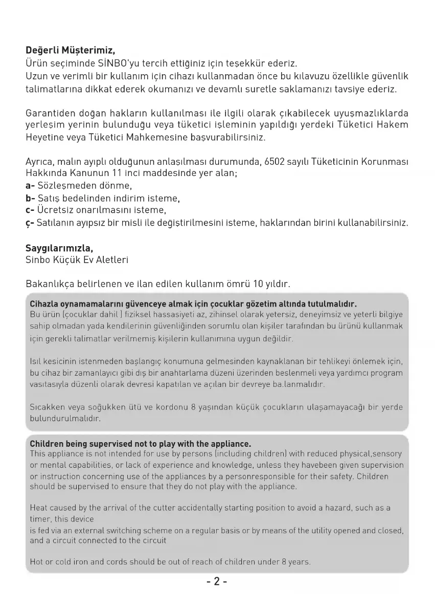 2. Ürünü kullanma k›lavuzunda belirtilen hususlara göre kullan›n›z.3. Ürününüzle ilgili hizmet talebiniz oldu¤unda yukar›daki telefonnumaralar›ndan, Tüketici Danıflma Hattına baflvurunuz.Garantiden do¤an haklar›n kullan›lmas› ile ilgili olarak ç›kabilecek uyuflmazl›klardayerleflim yerinin bulundu¤u veya tüketici iflleminin yap›ld›¤› yerdeki Tüketici HakemHeyetine veya Tüketici Mahkemesine baflvurabilirsiniz.Ayrıca, mal›n ay›pl› oldu¤unun anlafl›lmas› durumunda, 6502 say›l› Tüketicinin Korunmas›Hakk›nda Kanunun 11 inci maddesinde yer alan;a- Sözleflmeden dönme,b- Sat›fl bedelinden indirim isteme,c- Ücretsiz onar›lmas›n› isteme, ç- Sat›lan›n ay›ps›z bir misli ile de¤ifltirilmesini isteme, haklar›ndan birini kullanabilirsiniz. www.sinbo.comTÜKET‹C‹DANIfiMA HATTI Kap›dan Kap›ya Ücretsiz Servis Kampanyam›z dâhilinde Yurtiçi Kargo Firmas› ile iflbirli¤i içerindeyiz. Tüketicimiztaraf›ndan sat›n al›nan ürünün fiyat› ne olursa olsun, Tüketicimiz ürün ile ilgili garanti kapsam›na giren herhangi bir problem yaflad›¤›nda, 444 66 86 numaral› Tüketici Danıflma Hattımızı aramas› ve kay›t b›rakmas› yeterlidir. Bu süreçten sonra Tüketicimizin ürünü ücretsiz olarak Yurtiçi Kargo taraf›ndan Tüketicimizin bulundu¤u adrestenal›n›p, 10• ifl günü içerisinde ürün çal›fl›r bir vaziyette, yine Tüketicimize Yurtiçi Kargo arac›l›¤› ile adresine teslim edilmektedir. 10 ifl günü içerisinde sorunu çözülemeyen ürünler ise, yenisi ve/veya bir üst modeli ile de¤ifltirilmektedir. Tüm bu süreçte Tüketicilerimizden hiçbir ücret talep edilmemektedir.(•Ürünün servis garanti süresi, Yurtiçi Kargo ürünü Sinbo Fabrikas›’na teslim ettikten sonra bafllar.) SERV‹S KAPIDAN KAPIYA ÜCRETS‹Z GARANT‹S‹ 10 GÜNDE TESL‹MAT (•)- 66 - - GARANT‹ fiARTLARI -