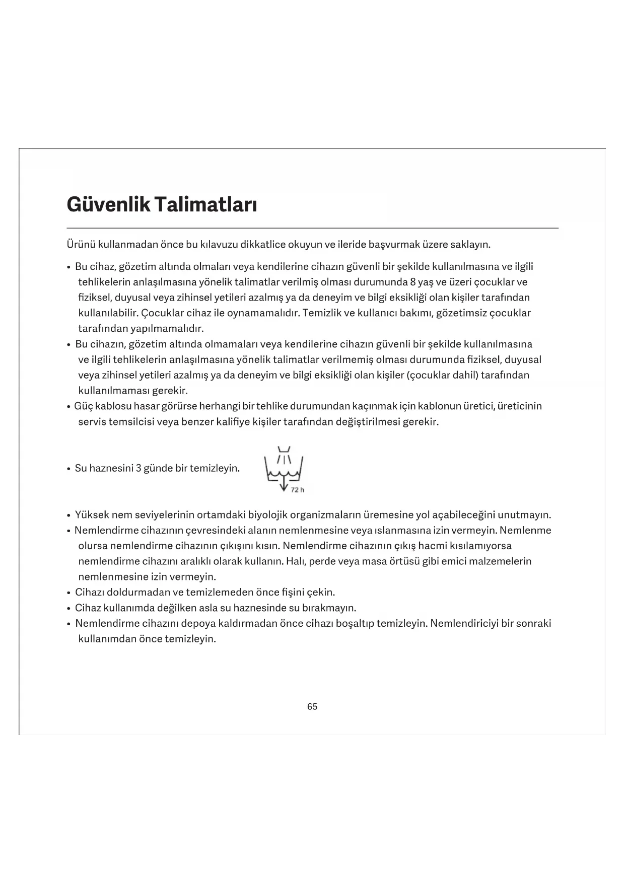 Güvenlik Talimatları• Hazneyi üç günde bir boşaltıp tekrar doldurun. Tekrar doldurmadan önce temiz musluk suyu veya gerekiyorsa üreticinin gerekli gördüğü temizlik maddeleriyle temizleyin. Haznenin yanlarında veya iç yüzeylerde oluşan kireci, kalıntıları veya tabakayı temizleyin ve tüm yüzeyleri bezle kurulayın.