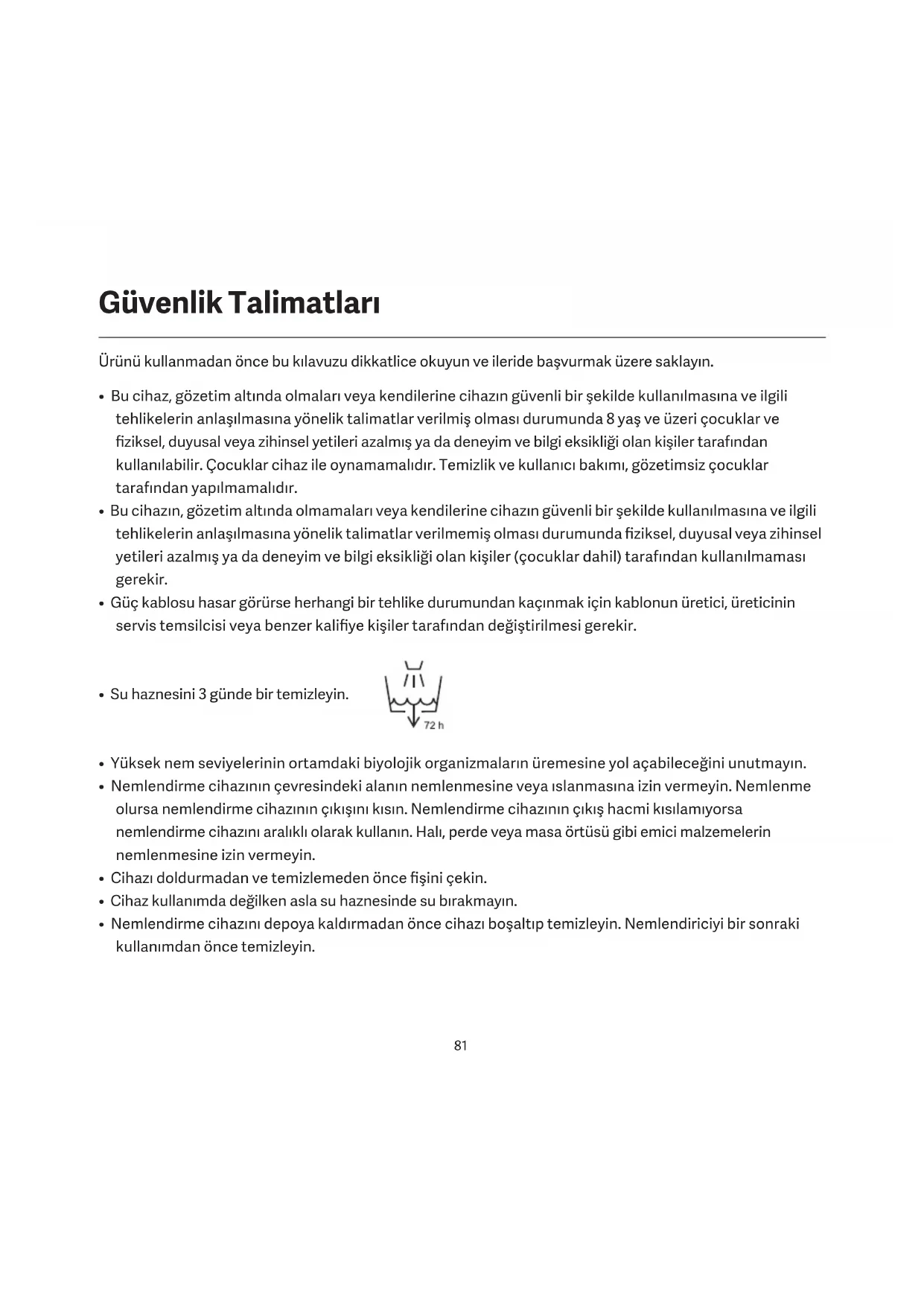 - UYARI: Suda veya cihazın kullanıldığı ya da saklandığı ortamda bulunan mikro organizmalar haznede çoğalabilir ve her 3 günde bir su yenilenmezse ve tank düzgün şekilde temizlenmezse havaya karışarak son derece ciddi sağlık risklerine neden olabilir.