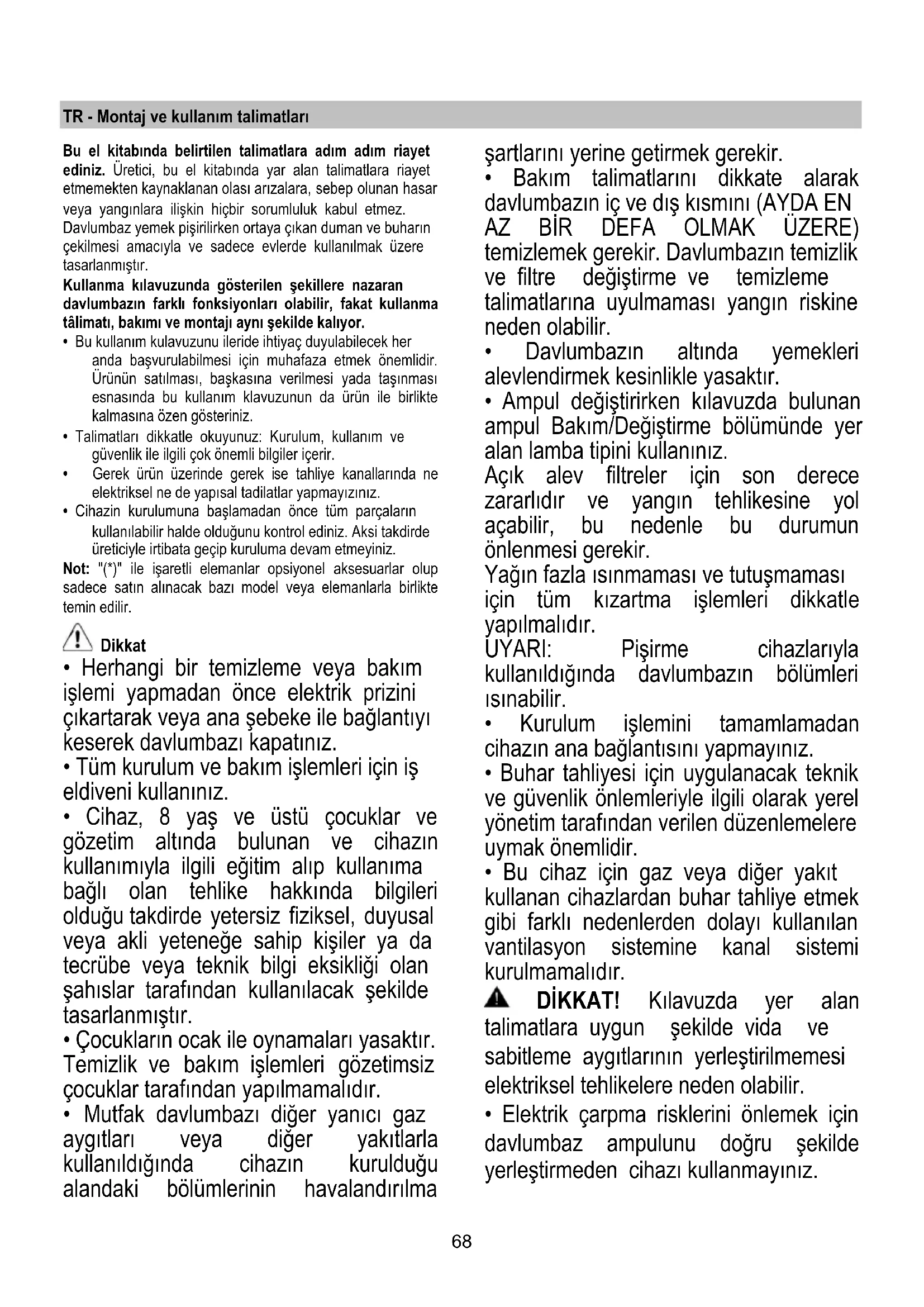 - Elektrik çarpma risklerini önlemek için davlumbaz ampulunu doğru şekilde yerleştirmeden cihazı kullanmayınız.69