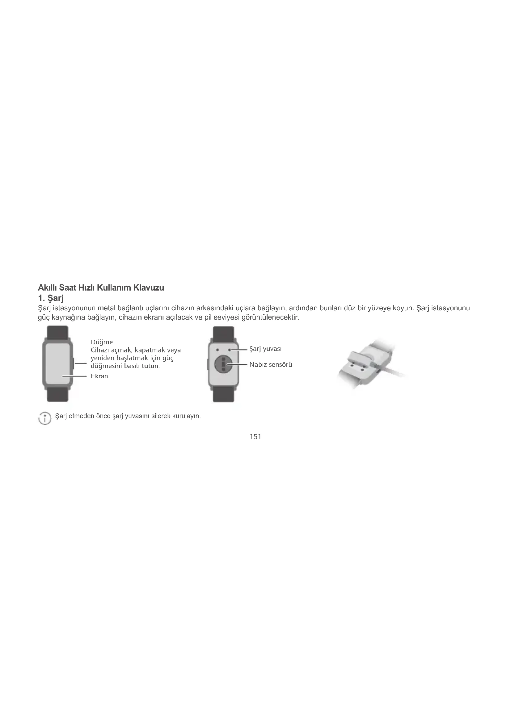 Şarj istasyonunun metal bağlantı uçlarını cihazın arkasındaki uçlara bağlayın, ardından bunları düz bir yüzeye koyun. Şarj istasyonunu güç kaynağına bağlayın, cihazın ekranı açılacak ve pil seviyesi görüntülenecektir. Akıllı Saat Hızlı Kullanım Klavuzu Düğme Cihazı açmak, kapatmak veya yeniden başlatmak için güç düğmesini basılı tutun. Nabız sensörü Şarj yuvası Şarj etmeden önce şarj yuvasını silerek kurulayın. Ekran152