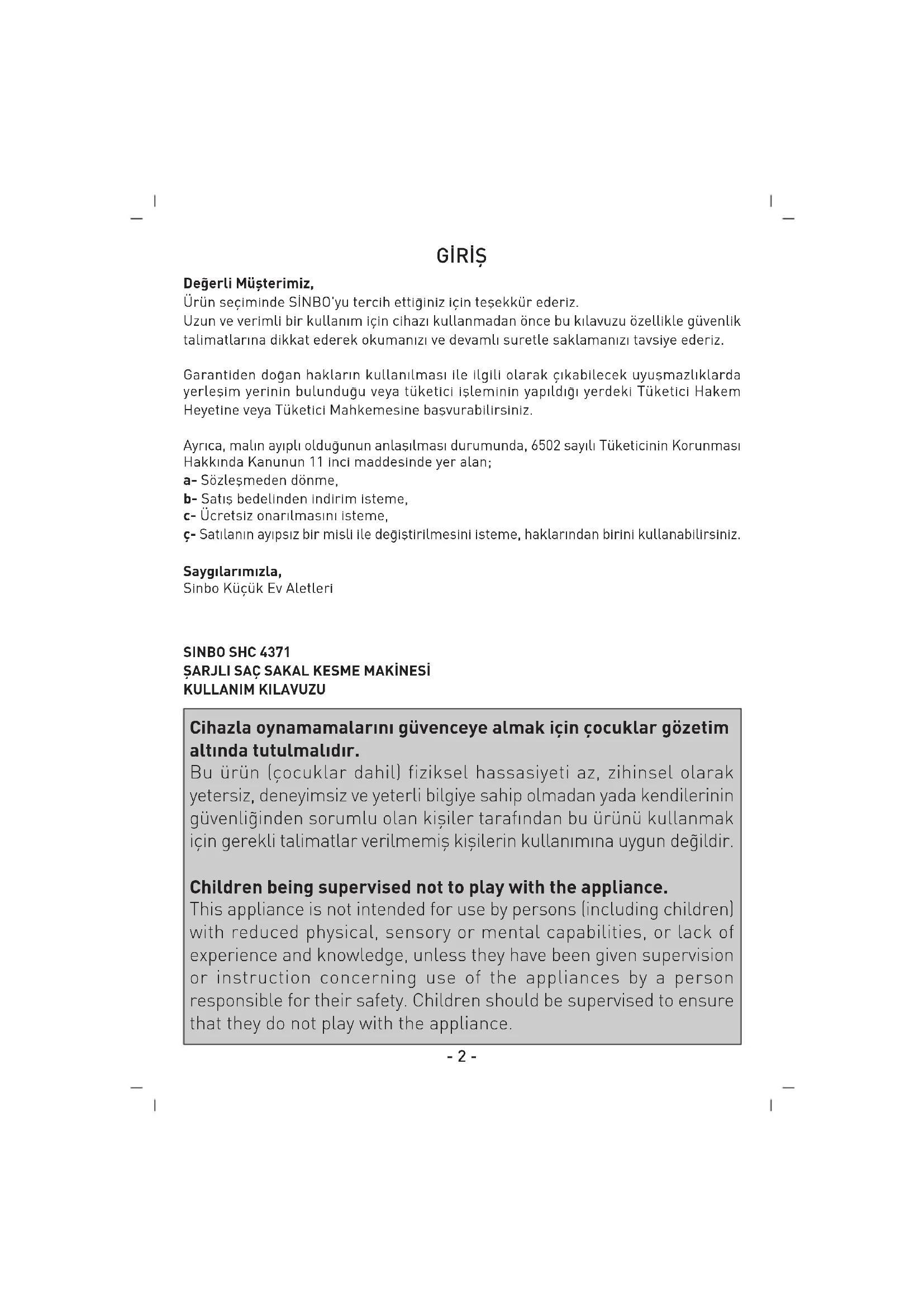 G‹R‹fi Cihazla oynamamalarını güvenceye almak için çocuklar gözetim altında tutulmalıdır. Bu ürün (çocuklar dahil) fiziksel hassasiyeti az, zihinsel olarak yetersiz, deneyimsiz ve yeterli bilgiye sahip olmadan yada kendilerinin güvenli¤inden sorumlu olan kifliler tarafından bu ürünü kullanmak için gerekli talimatlar verilmemifl kiflilerin kullanımına uygun de¤ildir. Children being supervised not to play with the appliance. This appliance is not intended for use by persons (including children) with reduced physical, sensory or mental capabilities, or lack of experience and knowledge, unless they have been given supervision or instruction concerning use of the appliances by a person responsible for their safety. Children should be supervised to ensure that they do not play with the appliance. De¤erli Müflterimiz, Ürün seçiminde S‹NBO'yu tercih etti¤iniz için teflekkür ederiz. Uzun ve verimli bir kullan›m için cihaz› kullanmadan önce bu k›lavuzu özellikle güvenlik talimatlar›na dikkat ederek okuman›z› ve devaml› suretle saklaman›z› tavsiye ederiz. Garantiden do¤an haklar›n kullan›lmas› ile ilgili olarak ç›kabilecek uyuflmazl›klarda yerleflim yerinin bulundu¤u veya tüketici iflleminin yap›ld›¤› yerdeki Tüketici Hakem Heyetine veya Tüketici Mahkemesine baflvurabilirsiniz. Ayrıca, mal›n ay›pl› oldu¤unun anlafl›lmas› durumunda, 6502 say›l› Tüketicinin Korunmas› Hakk›nda Kanunun 11 inci maddesinde yer alan; a- Sözleflmeden dönme, b- Sat›fl bedelinden indirim isteme, c- Ücretsiz onar›lmas›n› isteme, ç- Sat›lan›n ay›ps›z bir misli ile de¤ifltirilmesini isteme, haklar›ndan birini kullanabilirsiniz. Sayg›lar›m›zla, Sinbo Küçük Ev Aletleri SINBO SHC 4371 fiARJLI SAÇ SAKAL KESME MAK‹NES‹ KULLANIM KILAVUZU- 3 - SINBO SHC 4371