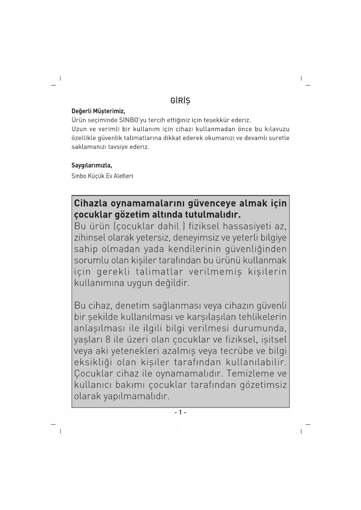 65 65- 1 - De¤erli Müflterimiz, Ürün seçiminde S‹NBO'yu tercih etti¤iniz için teflekkür ederiz. Uzun ve verimli bir kullan›m için cihaz› kullanmadan önce bu k›lavuzu özellikle güvenlik talimatlar›na dikkat ederek okuman›z› ve devaml› suretle saklaman›z› tavsiye ederiz. Sayg›lar›m›zla, Sinbo Küçük Ev Aletleri G‹R‹fi Cihazla oynamamalarını güvenceye almak için çocuklar gözetim altında tutulmalıdır. Bu ürün (çocuklar dahil ) fiziksel hassasiyeti az, zihinsel olarak yetersiz, deneyimsiz ve yeterli bilgiye sahip olmadan yada kendilerinin güvenli¤inden sorumlu olan kifliler tarafından bu ürünü kullanmak için gerekli talimatlar verilmemifl kiflilerin kullanımına uygun de¤ildir. Bu cihaz, denetim sa¤lanması veya cihazın güvenli bir flekilde kullanılması ve karflılaflılan tehlikelerin anlaflılması ile ilgili bilgi verilmesi durumunda, yaflları 8 ile üzeri olan çocuklar ve fiziksel, iflitsel veya aki yetenekleri azalmıfl veya tecrübe ve bilgi eksikli¤i olan kifliler tarafından kullanılabilir. Çocuklar cihaz ile oynamamalıdır. Temizleme ve kullanıcı bakımı çocuklar tarafından gözetimsiz olarak yapılmamalıdır.- 2 - D‹KKAT!! Ürünün üzerinde bulunan iflaretlemelerde veya ürünle verilen di¤er bas›l› dökümanlarda beyan edilen de¤erler, ilgili standartlara göre laboratuar ortam›nda elde edilen de¤erlerdir.Bu de¤erler, ürünün kullan›m ve ortam flartlar›na göre de¤iflebilir. Bu cihaz kalite belgesine haizdir. Kullanım Ömrü 7 yıldır. Made in Turkey - TÜRK MALI AC230V / 50Hz / 300W Not: Resimler ürünün asl›ndan farkl›l›k gösterebilir.