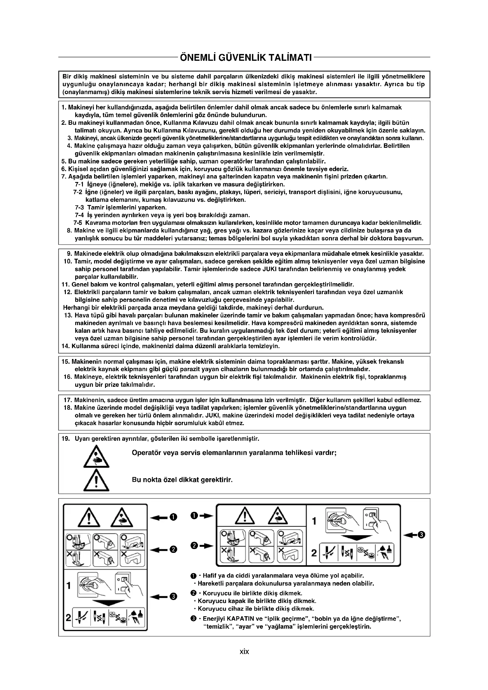 olmalı ve gereken her türlü önlem alınmalıdır. JUKI, makine üzerindeki model değişiklikleri veya tadilat nedeniyle ortaya çıkacak hasarlar konusunda hiçbir sorumluluk kabûl etmez.