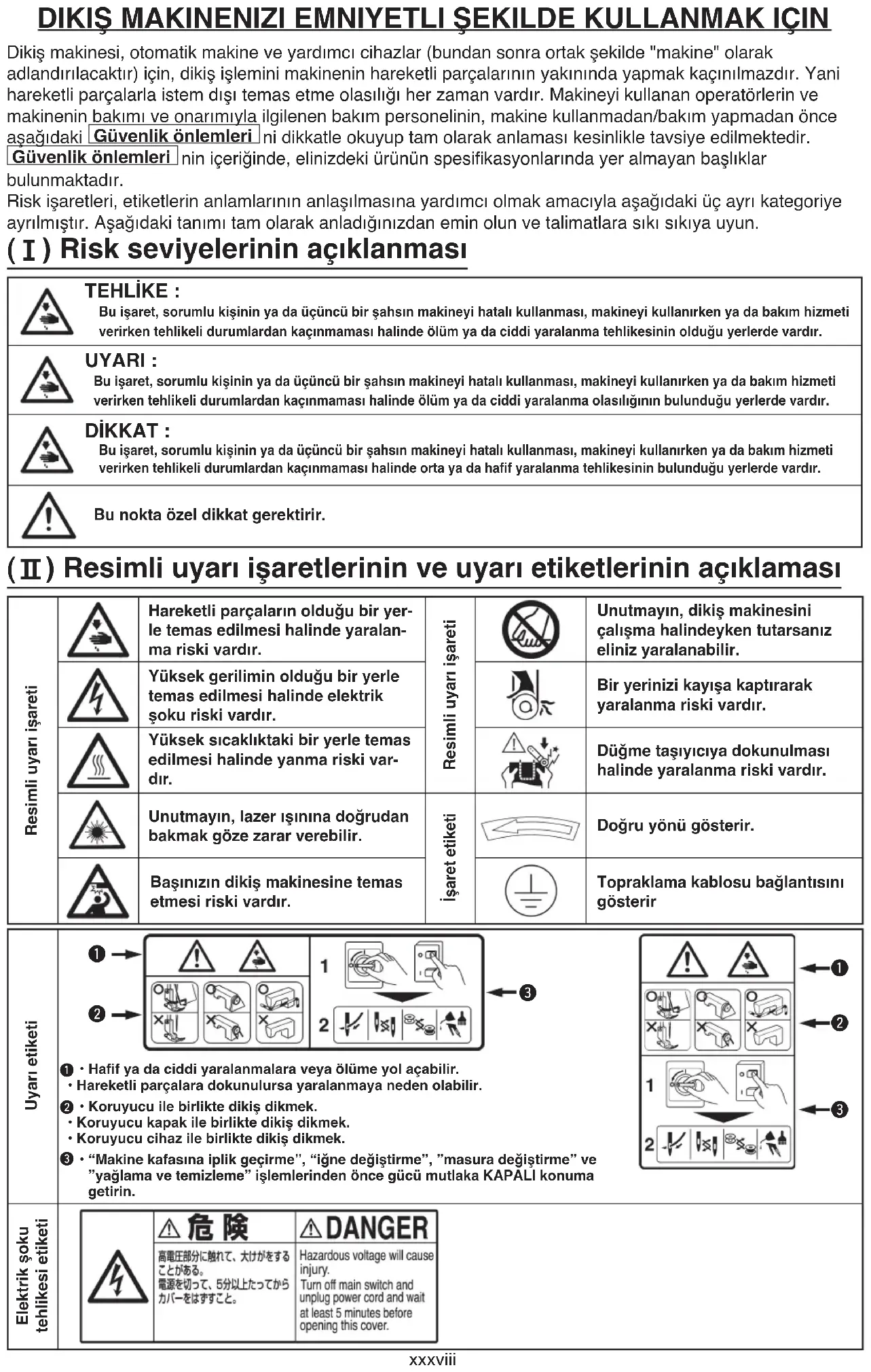 Güvenlik önlemleri niniçeriğinde,elinizdekiürününspesikasyonlarındayeralmayanbaşlıklar bulunmaktadır. Riskişaretleri,etiketlerinanlamlarınınanlaşılmasınayardımcıolmakamacıylaaşağıdakiüçayrıkategoriye ayrılmıştır.Aşağıdakitanımıtamolarakanladığınızdaneminolunvetalimatlarasıkısıkıyauyun. DIKIŞ MAKINENIZI EMNIYETLI ŞEKILDE KULLANMAK IÇIN