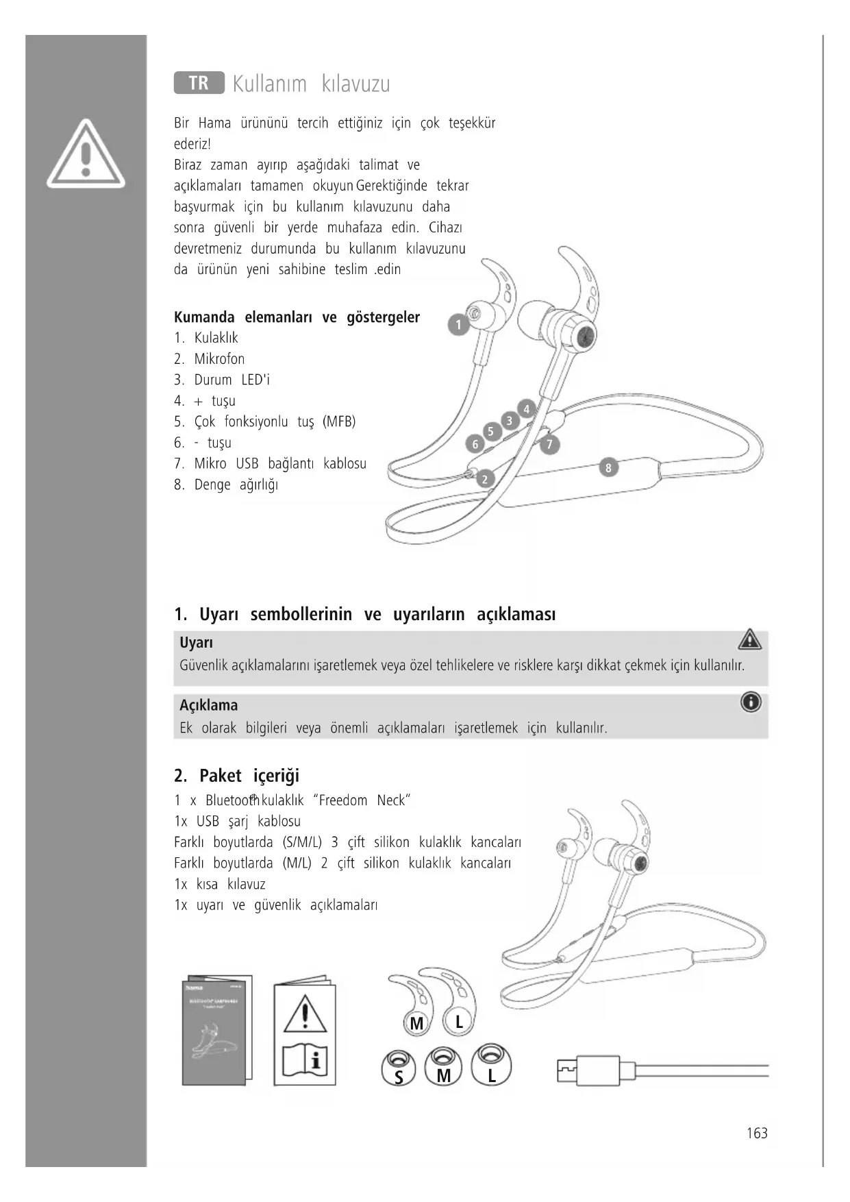 kulaklık “Freedom Neck” 1x USB şarj kablosu Farklı boyutlarda (S/M/L) 3 çift silikon kulaklık kancaları Farklı boyutlarda (M/L) 2 çift silikon kulaklık kancaları 1x kısa kılavuz 1x uyarı ve güvenlik açıklamaları