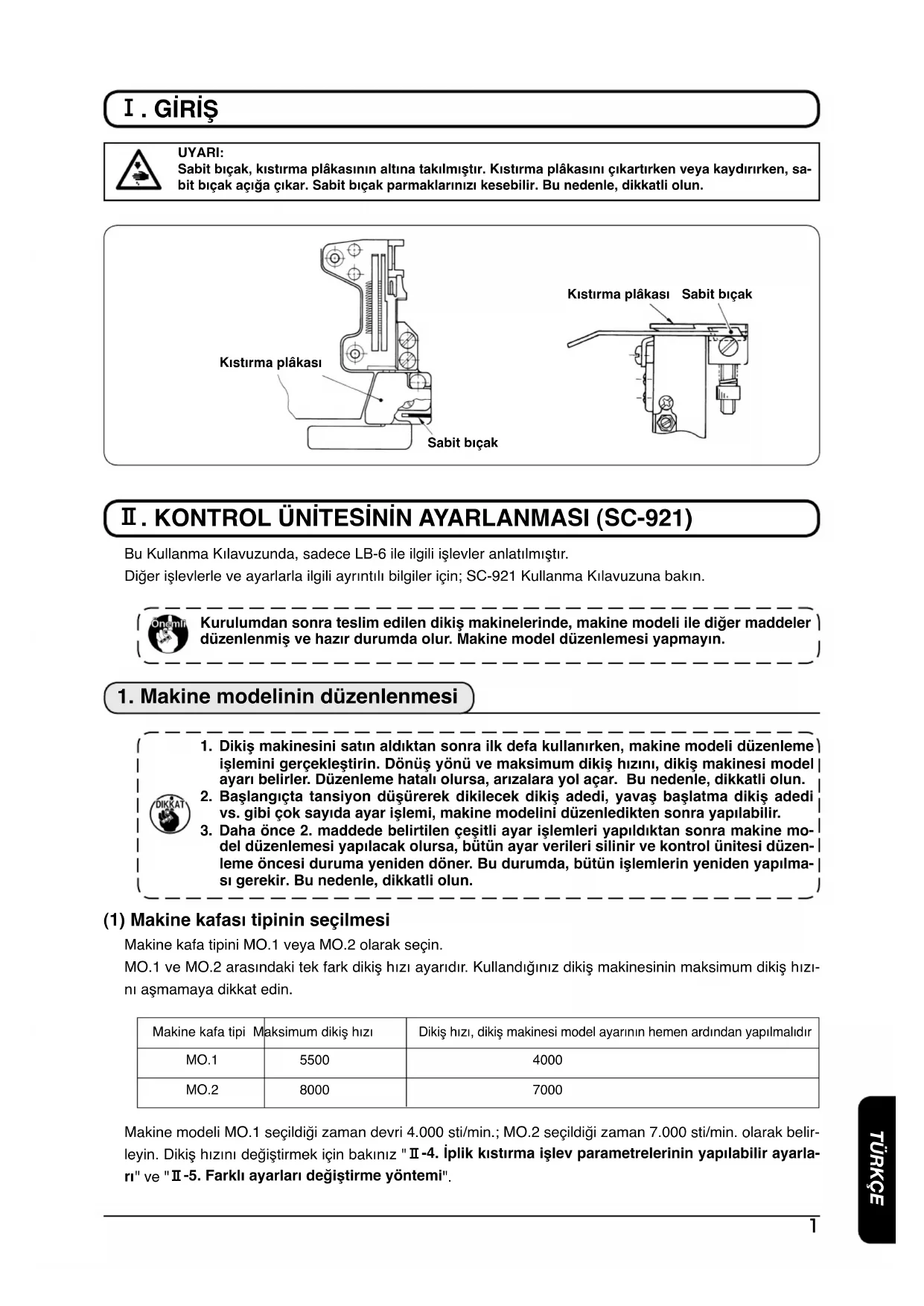 . GİRİŞ UYARI: Sabit bıçak, kıstırma plâkasının altına takılmıştır. Kıstırma plâkasını çıkartırken veya kaydırırken, sa- bit bıçak açığa çıkar. Sabit bıçak parmaklarınızı kesebilir. Bu nedenle, dikkatli olun. Kıstırma plâkası Sabit bıçak Makine modeli MO.1 seçildiği zaman devri 4.000 sti/min.; MO.2 seçildiği zaman 7.000 sti/min. olarak belir- leyin. Dikiş hızını değiştirmek için bakınız "