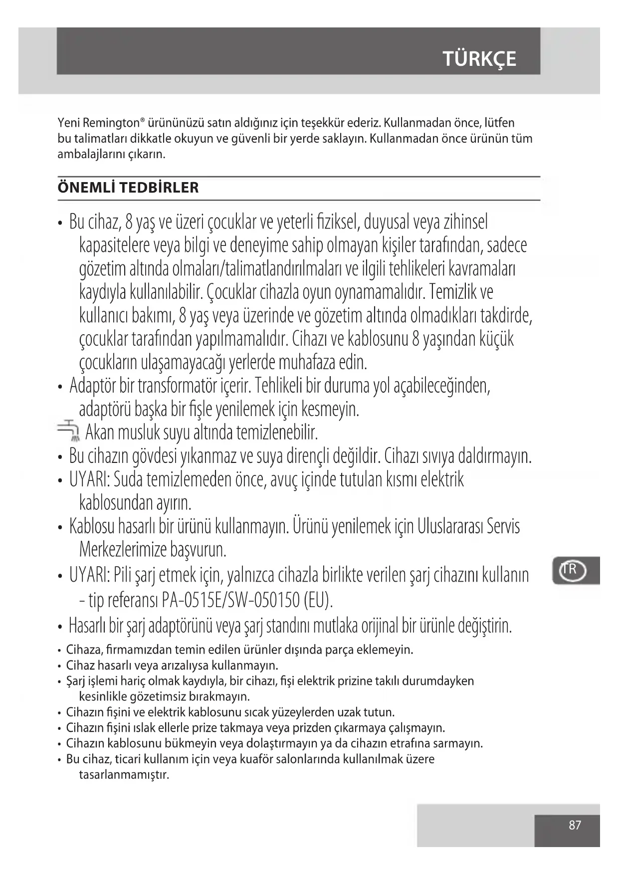 Yeni Remington® ürününüzü satın aldığınız için teşekkür ederiz. Kullanmadan önce, lütfen bu talimatları dikkatle okuyun ve güvenli bir yerde saklayın. Kullanmadan önce ürünün tüm ambalajlarını çıkarın.