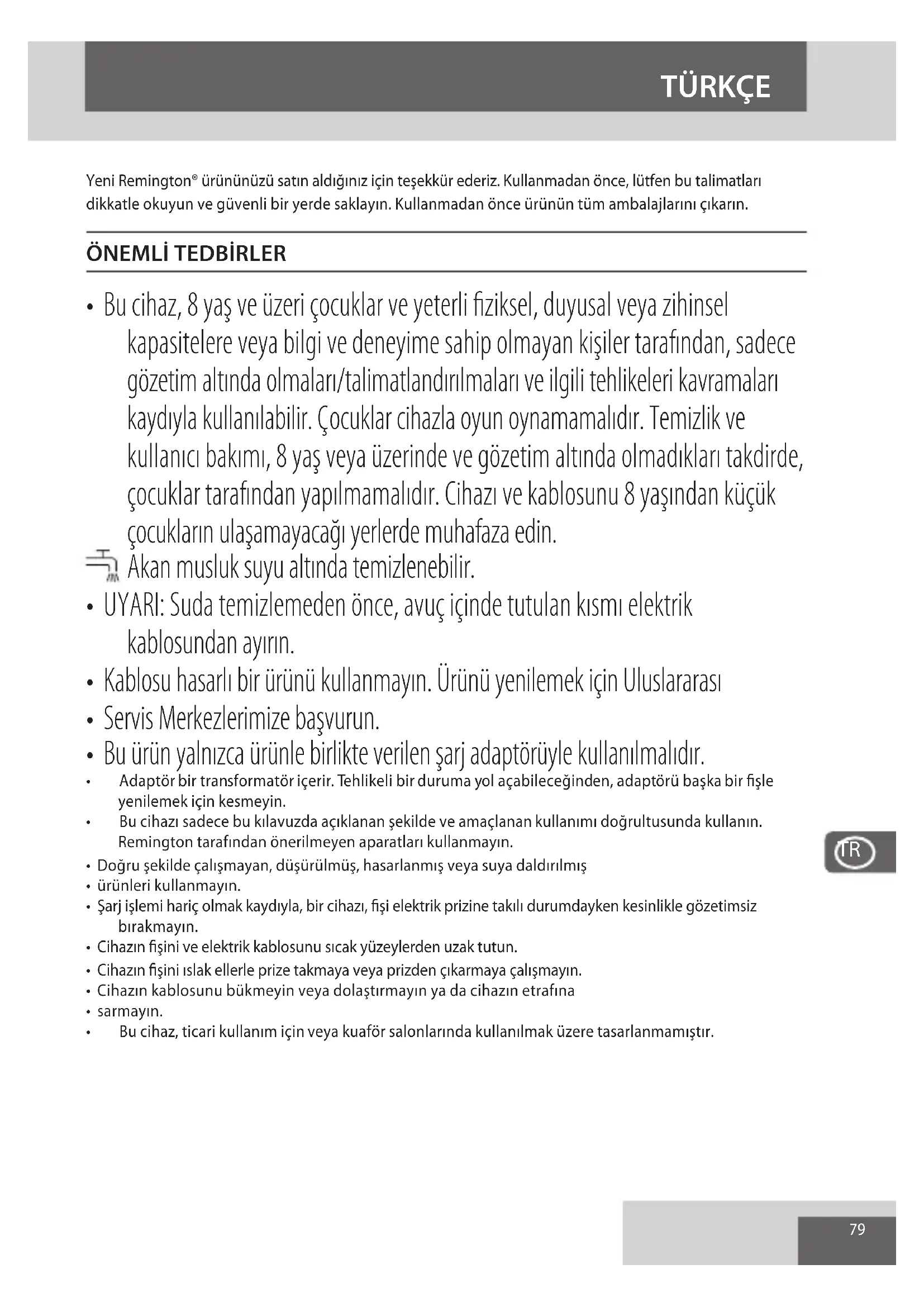 - Bu cihazı sadece bu kılavuzda açıklanan şekilde ve amaçlanan kullanımı doğrultusunda kullanın. Remington tarafından önerilmeyen aparatları kullanmayın.