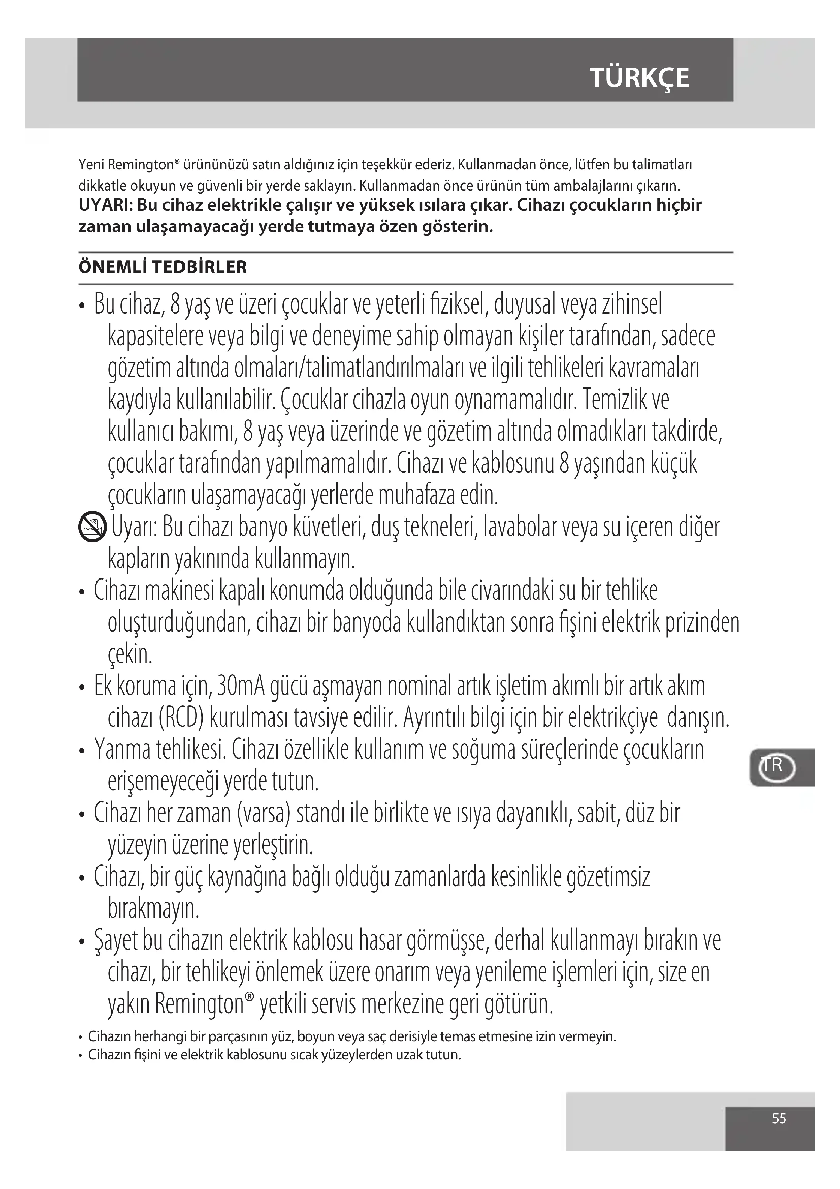 Yeni Remington® ürününüzü satın aldığınız için teşekkür ederiz. Kullanmadan önce, lütfen bu talimatları dikkatle okuyun ve güvenli bir yerde saklayın. Kullanmadan önce ürünün tüm ambalajlarını çıkarın. UYARI: Bu cihaz elektrikle çalışır ve yüksek ısılara çıkar. Cihazı çocukların hiçbir zaman ulaşamayacağı yerde tutmaya özen gösterin.