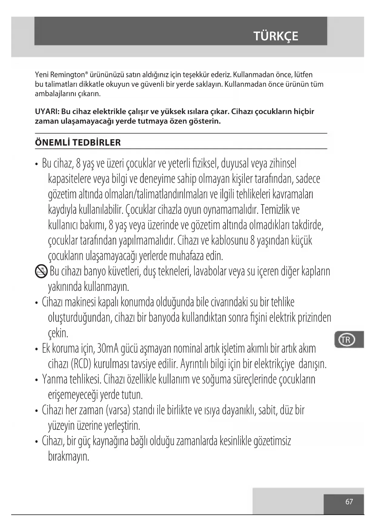 - Şayet bu cihazın elektrik kablosu hasar görmüşse, derhal kullanmayı bırakın ve cihazı, bir tehlikeyi önlemek üzere onarım veya yenileme işlemleri için, size en yakın Remington® yetkili servis merkezine geri götürün.