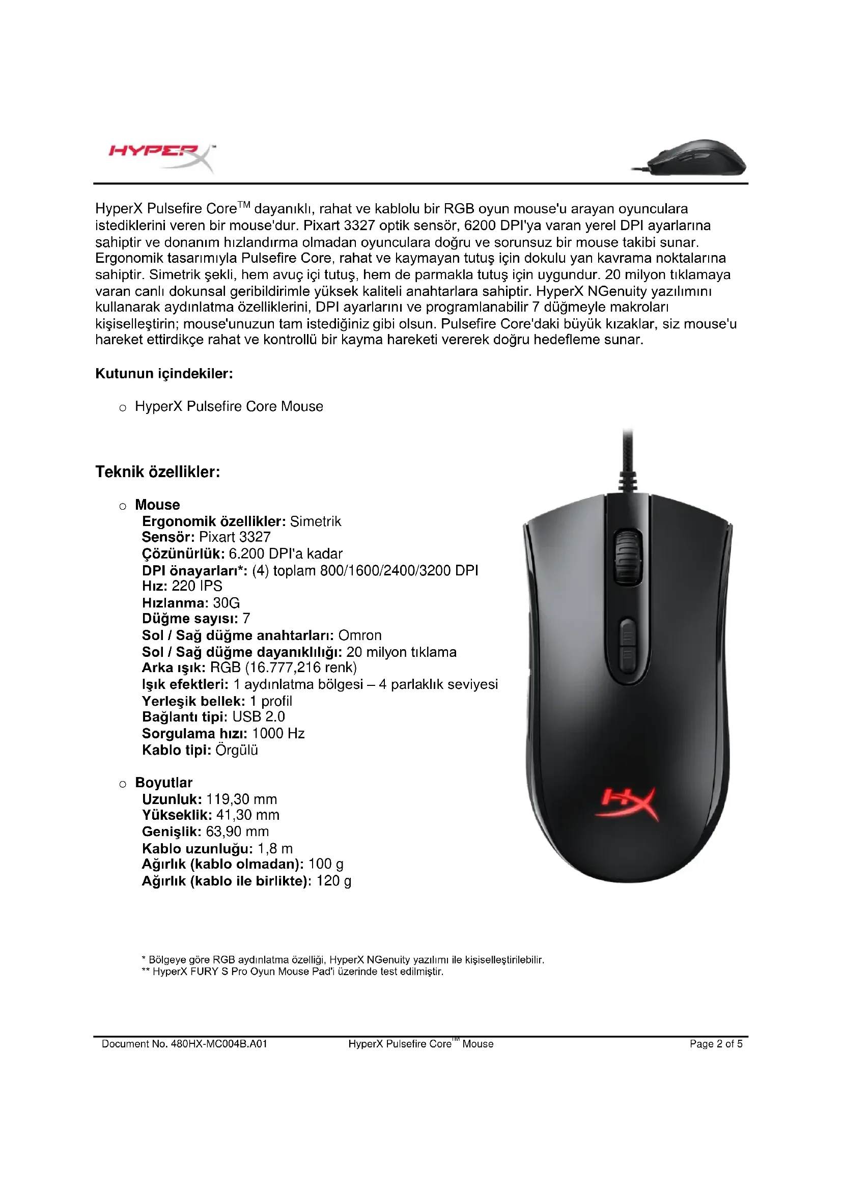 Teknik özellikler: o Mouse Ergonomik özellikler: Simetrik Sensör: Pixart 3327 Çözünürlük: 6.200 DPI'a kadar DPI önayarları*: (4) toplam 800/1600/2400/3200 DPI Hız: 220 IPS Hızlanma: 30G Düğme sayısı: 7 Sol / Sağ düğme anahtarları: Omron Sol / Sağ düğme dayanıklılığı: 20 milyon tıklama Arka ışık: RGB (16.777,216 renk) Işık efektleri: 1 aydınlatma bölgesi – 4 parlaklık seviyesi Yerleşik bellek: 1 profil Bağlantı tipi: USB 2.0 Sorgulama hızı: 1000 Hz Kablo tipi: Örgülü o Boyutlar Uzunluk: 119,30 mm Yükseklik: 41,30 mm Genişlik: 63,90 mm Kablo uzunluğu: 1,8 m Ağırlık (kablo olmadan): 100 g Ağırlık (kablo ile birlikte): 120 g