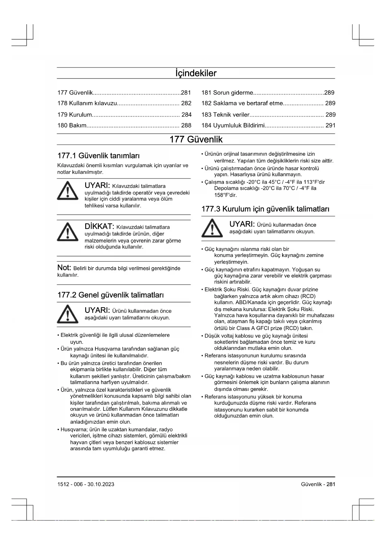 177.3 Kurulum için güvenlik talimatları