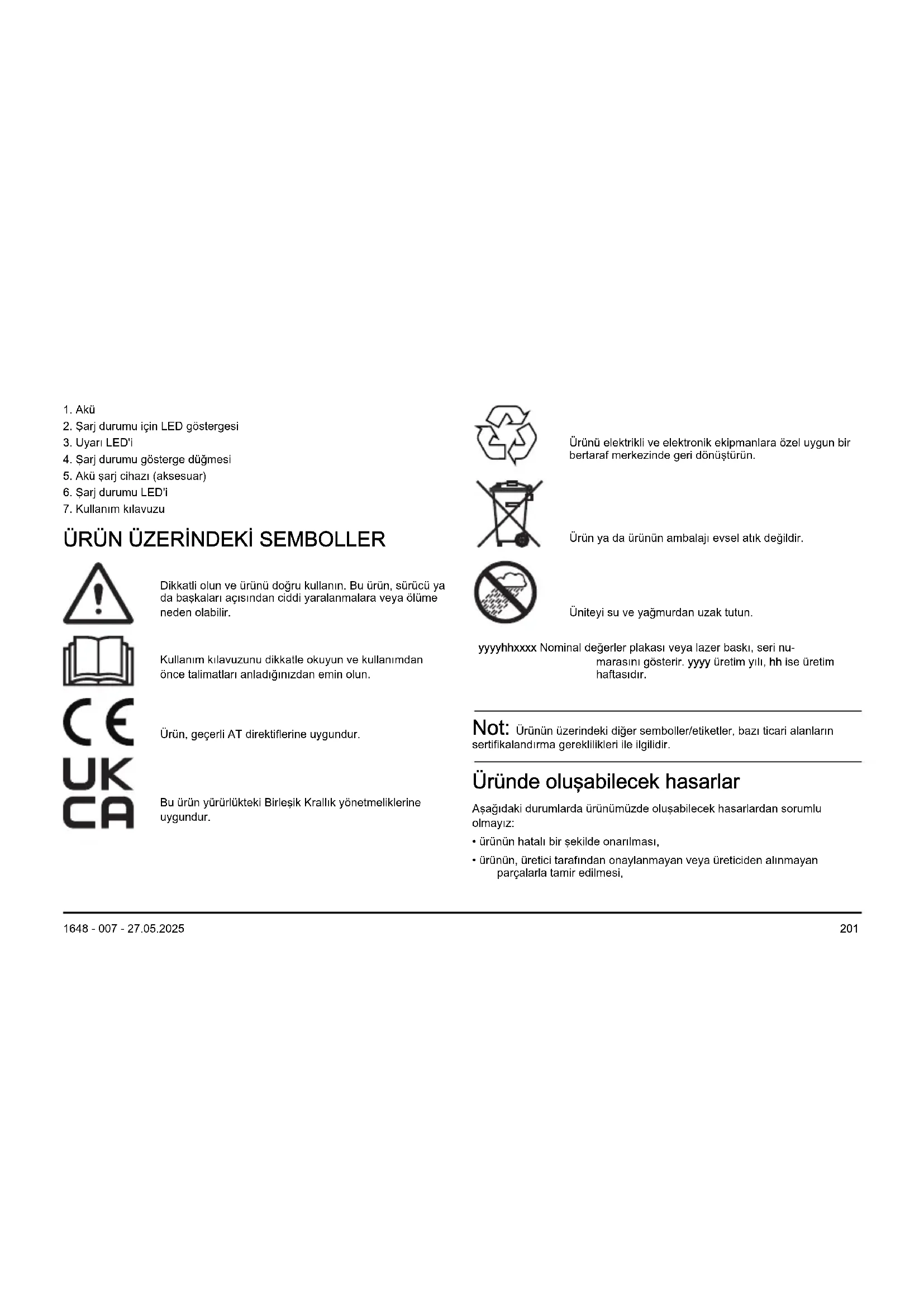 - Aküyü depoya kaldırmadan önce temizleyin. 1648 - 007 - 27.05.2025 205Bertaraf Sembol, ürünün evsel atık olmadığını gösterir. Ürünü elektrikli ve elektronik ekipmanlar için yerel toplama sisteminizden geri dönüştürün. Bu, uygun kullanım ömrü sonu atık yönetimine katkıda bulunur. Bilgi için yerel yetkililere, evsel atık hizmetlerine, bayinize veya satıcınıza başvurun. Yanlış bertarafın, tehlikeli maddelerin bulunma olasılığı nedeniyle çevre ve insan sağlığı üzerinde olumsuz etkileri olabilir. Not: Sembol, ürün veya ürün paketi üzerinde gösterilir.