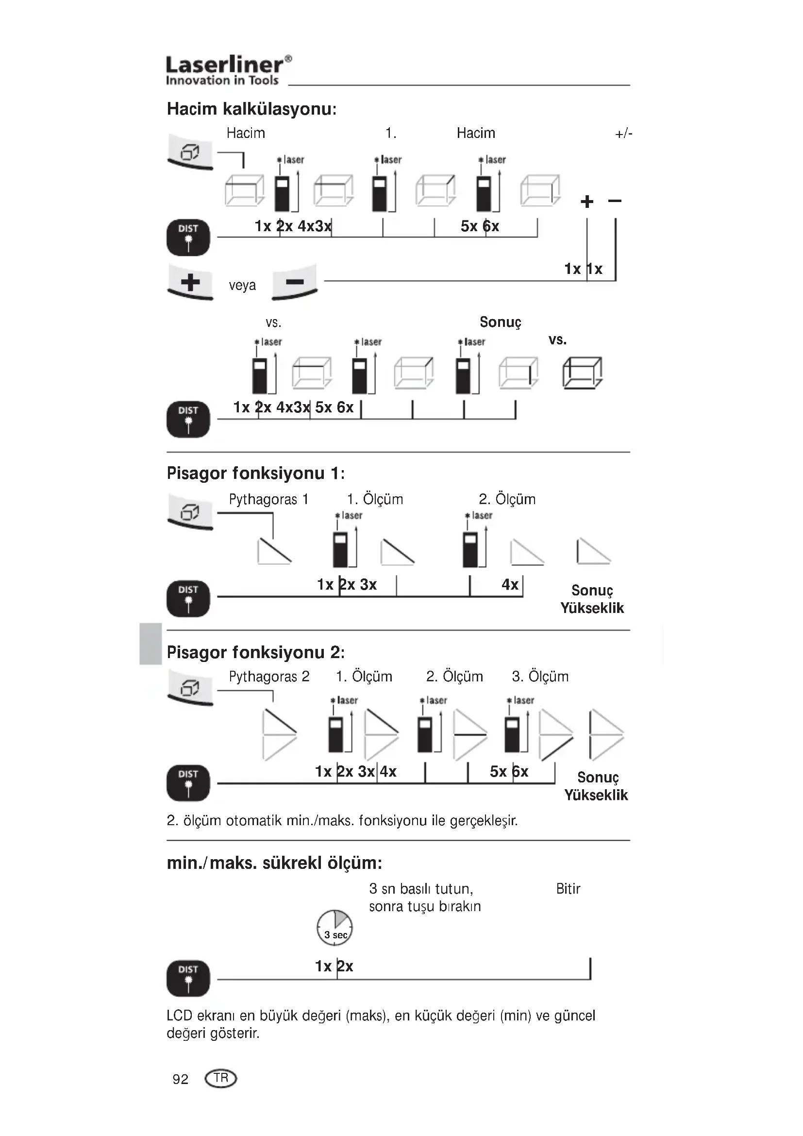 5x 6x veya Hacim kalkülasyonu: Hacim 1. Hacim +/- vs. Sonuç vs. Pisagor fonksiyonu 1: Pythagoras 1 1. Ölçüm 2. Ölçüm Pisagor fonksiyonu 2: Pythagoras 2 1. Ölçüm 2. Ölçüm 3. Ölçüm min./maks. sükrekl ölçüm: 3 sn basÚlÚ tutun, Bitir sonra tuŭu bÚrakÚn LCD ekranÚ en büyük deŒeri (maks), en küçük deŒeri (min) ve güncel deŒeri gösterir.