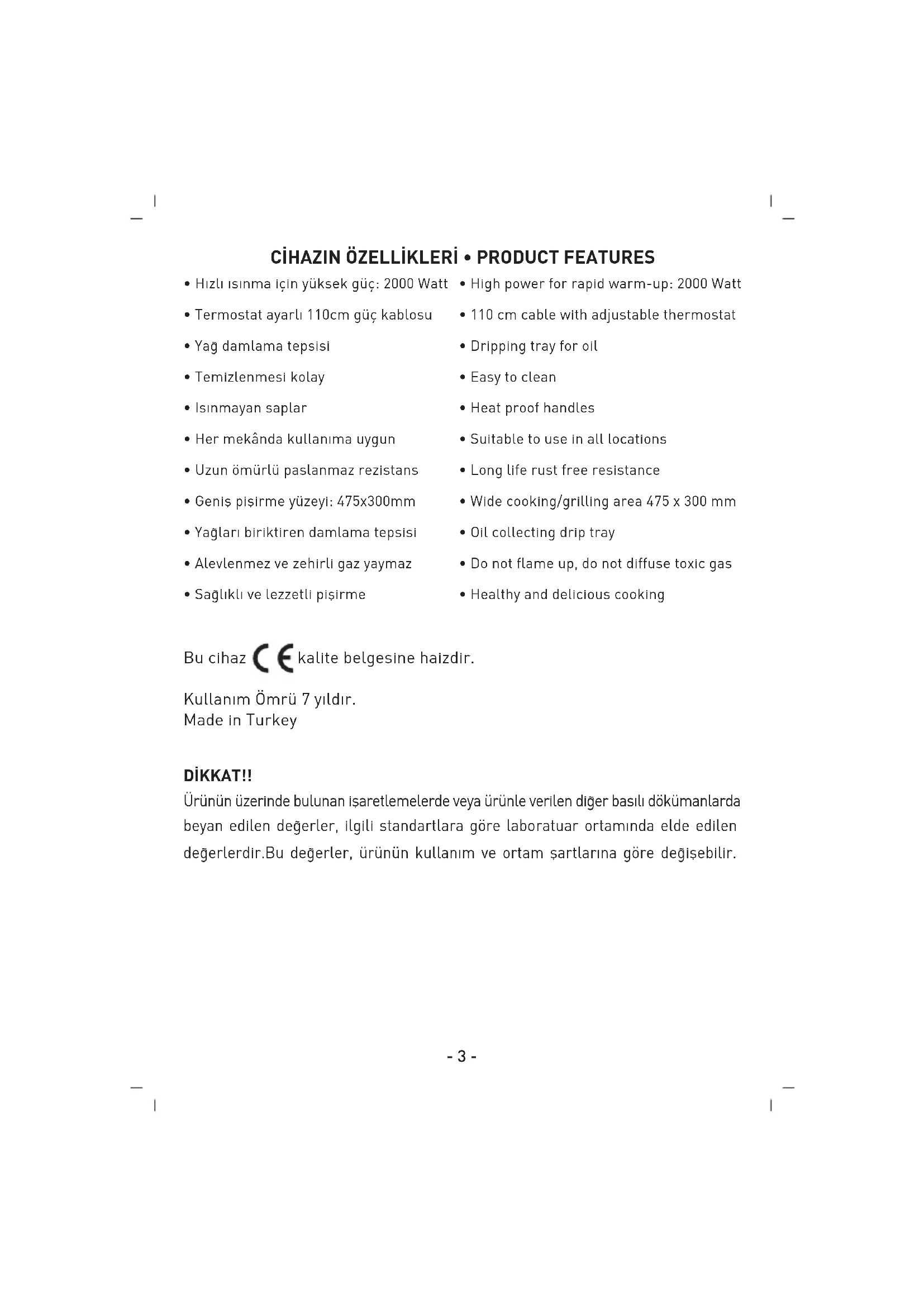 D‹KKAT!! Ürünün üzerinde bulunan iflaretlemelerde veya ürünle verilen di¤er bas›l› dökümanlarda beyan edilen de¤erler, ilgili standartlara göre laboratuar ortam›nda elde edilen de¤erlerdir.Bu de¤erler, ürünün kullan›m ve ortam flartlar›na göre de¤iflebilir. Bu cihaz kalite belgesine haizdir. Kullanım Ömrü 7 yıldır. Made in Turkey