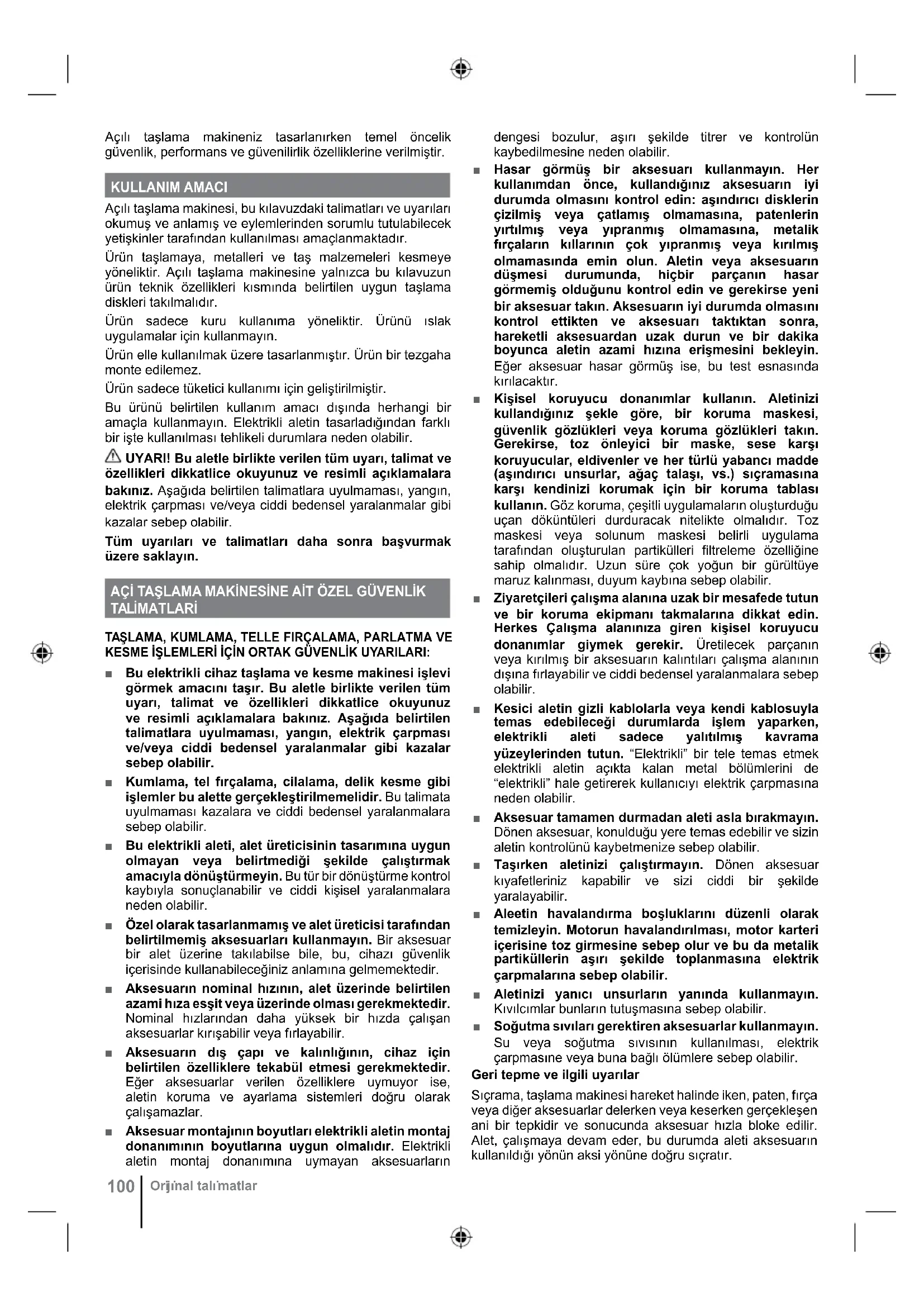 Saniyede devir veya hareket sayıs Makineyi çalıştırmadan talimatları dikkatlice okuyun. Koruyucu kulaklık kullanın Her zaman koruyucu gözlük kullanın. Toz maskesi kullanın. Her zaman iki el kullanarak çalıştırın Emniyet eldivenleri giyin Kaymaz tabanlı emniyet ayakkabıları giyin. Kırık, çatlak ya da arızalı taşlama çarkını kullanmayın Kesim için kullanmayın. Kesme işlemlerinde korumayı kullanmayın Bir siper kullanın Metal Sulu taşlamaya uygun değildir. Su veya soğutma sıvısının kullanılması, elektrik çarpmasıne veya buna bağlı ölümlere sebep olabilir. Alın taşlama için kullanmayın.TÜRKÇE