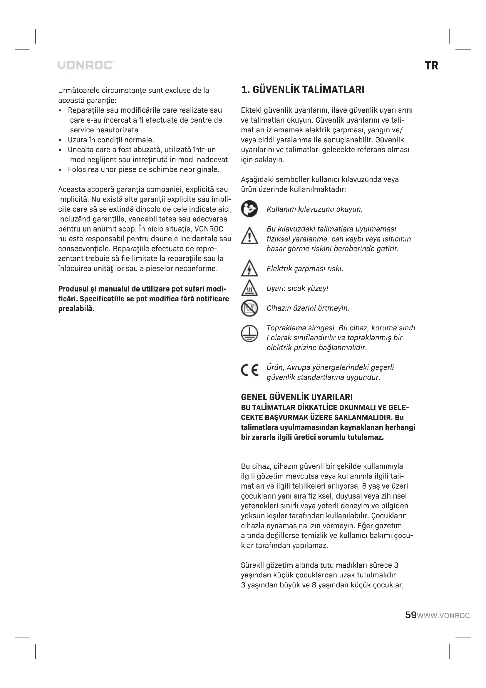 GARANTİ VONROC urunleri yuksek kalite standartları doğrul- tusunda geliştirilmiştir ve ilk satın alımdan itibaren kanunen belirlenen sure boyunca materyal ve işcilik acısından kusursuz olacağı garanti edilmektedir. Bu sure zarfında, kusurlu materyal ve/veya işcilikten dolayı urunde herhangi bir arıza meydana gelmesi durumunda, doğrudan VONROC iletişim kurun. Takip eden durumlar bu garanti kapsamı dışındadır: