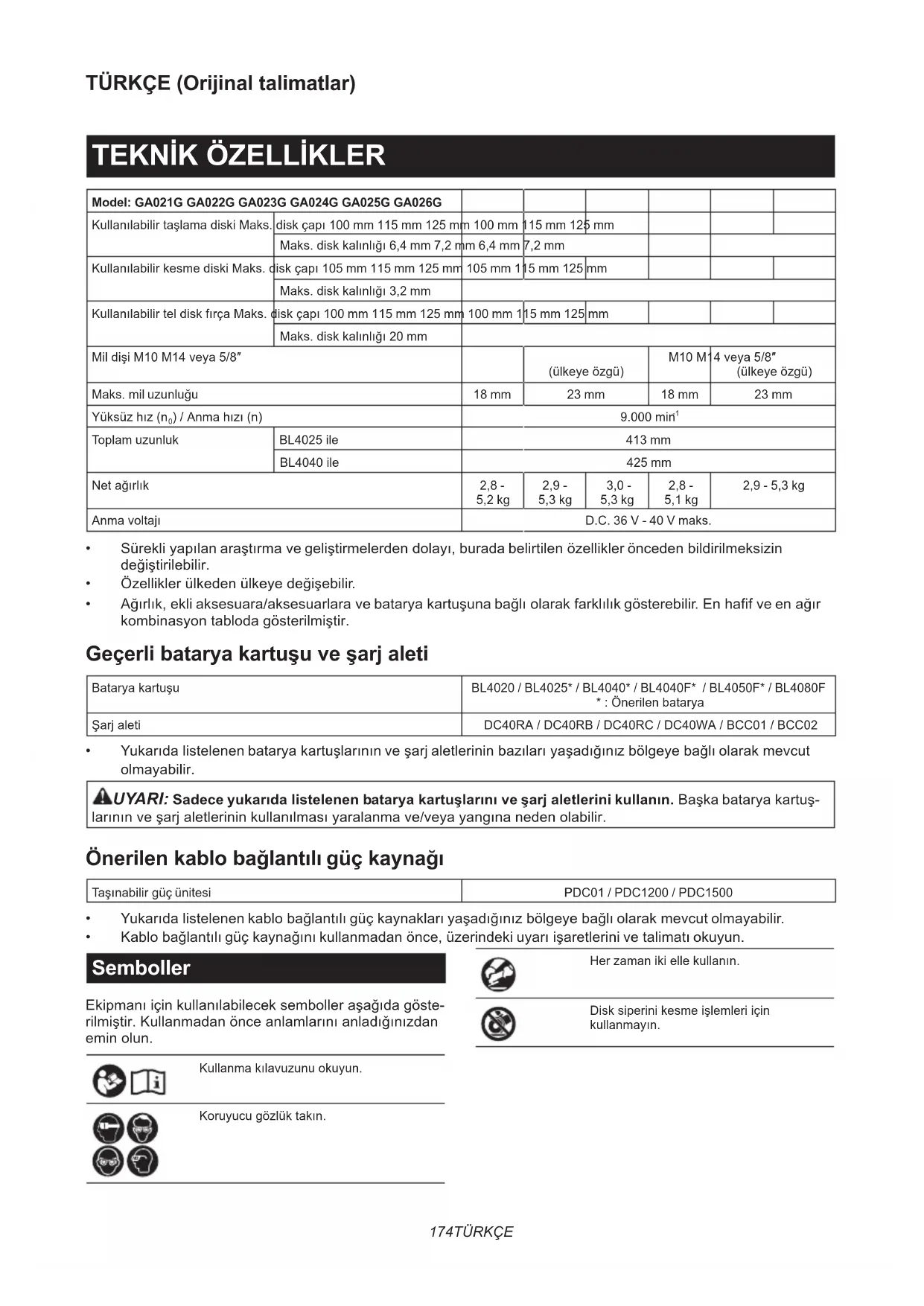 - Kablo bağlantılı güç kaynağını kullanmadan önce, üzerindeki uyarı işaretlerini ve talimatı okuyun. Semboller Ekipmanı için kullanılabilecek semboller aşağıda göste- rilmiştir. Kullanmadan önce anlamlarını anladığınızdan emin olun. Kullanma kılavuzunu okuyun. Koruyucu gözlük takın. Her zaman iki elle kullanın. Disk siperini kesme işlemleri için kullanmayın.175 TÜRKÇE Ni-MH Li-ion Sadece AB ülkeleri için Ekipmanda tehlikeli bileşenler bulundu- ğundan dolayı atık elektrikli ve elektronik ekipmanlar, aküler ve bataryalar çevre ve insan sağlığı üzerinde olumsuz etkiye yol açabilir. Elektrikli ve elektronik cihazları veya batar- yaları evsel atıklarla birlikte atmayın! Atık elektrikli ve elektronik ekipmanlar ile akümülatörler ve bataryalar hakkındaki Avrupa Direktifi ve söz konusu direktifin ulusal yasalara uyarlanması gereğince atık elektrikli ekipmanlar, bataryalar ve akümülatörler ayrı olarak depolanmalı ve çevre koruma hakkındaki mevzuata uygun olarak faaliyet gösteren ayrı bir kentsel atık toplama noktasına teslim edilmelidir. Bu husus, ekipmanın üzerine yerleştirilmiş üzerinde çarpı işareti bulunan tekerlekli çöp kovası simgesi ile belirtilmiştir. Kullanım amacı Bu alet, metal ve taş malzemelerin su kullanmadan taşlanması, zımparalanması, telle fırçalanması, delik açılması ve kesilmesi amacıyla tasarlanmıştır. Gürültü Tipik A-ağırlıklı gürültü düzeyi (EN62841-2-3 standardına göre belirlenen): Model Ses basıncı seviyesi (L