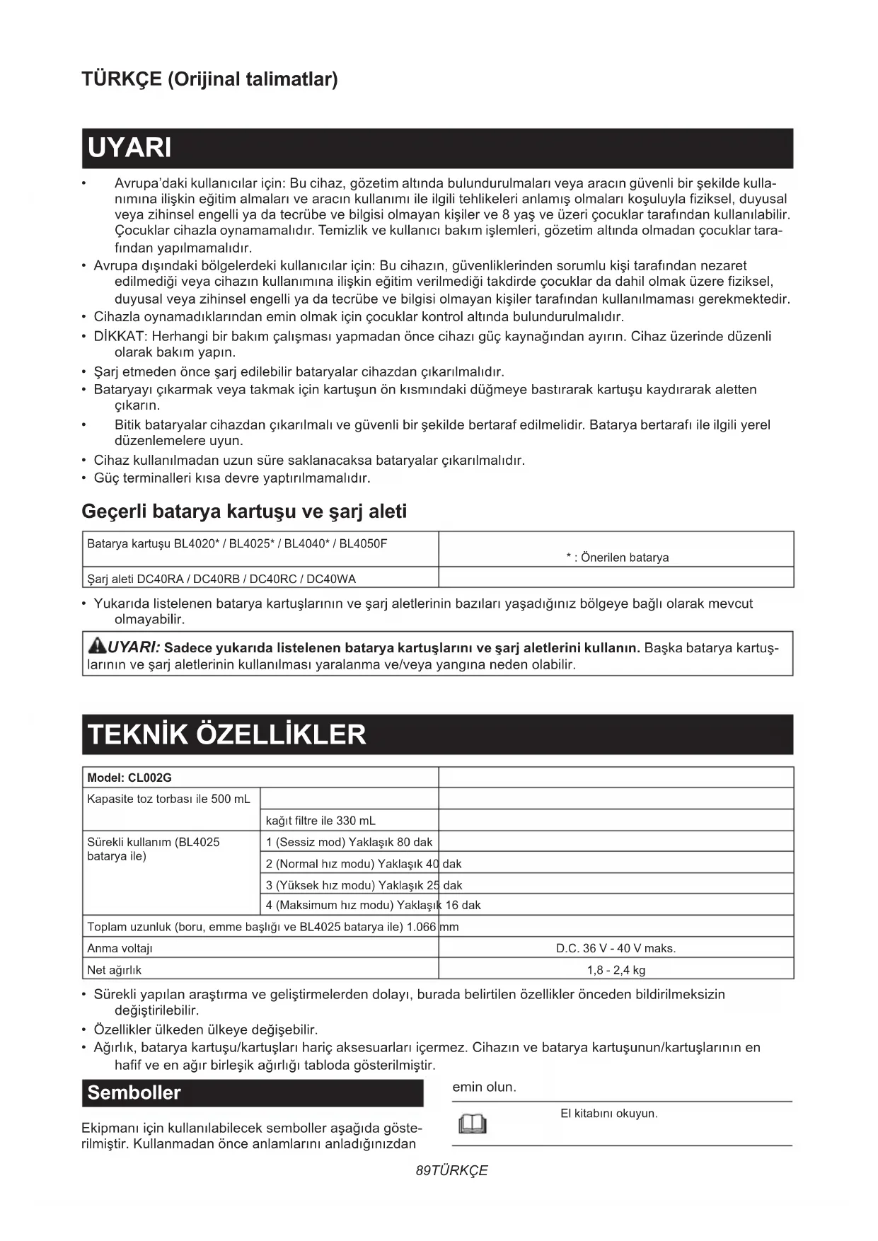 Model: CL002G Kapasite toz torbası ile 500 mL kağıt filtre ile 330 mL Sürekli kullanım (BL4025 batarya ile) 1 (Sessiz mod) Yaklaşık 80 dak 2 (Normal hız modu) Yaklaşık 40 dak 3 (Yüksek hız modu) Yaklaşık 25 dak 4 (Maksimum hız modu) Yaklaşık 16 dak Toplam uzunluk (boru, emme başlığı ve BL4025 batarya ile) 1.066 mm Anma voltajı D.C. 36 V - 40 V maks. Net ağırlık 1,8 - 2,4 kg