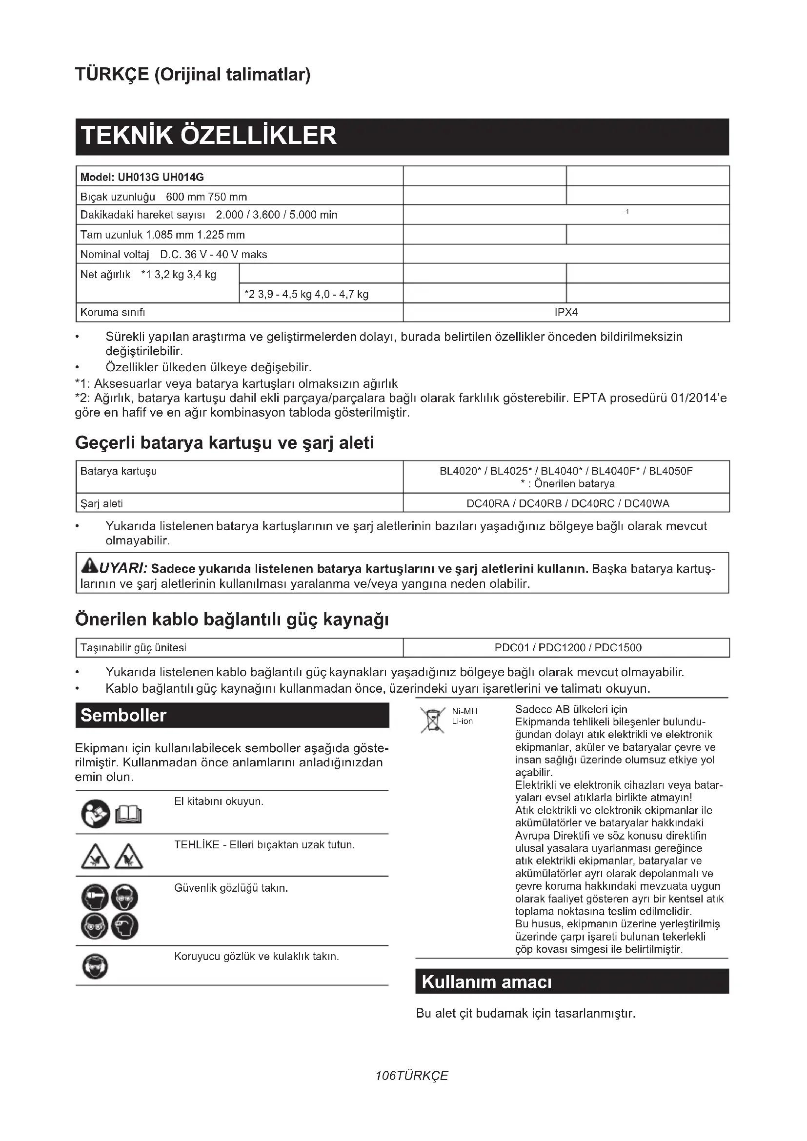 - Kablobağlantılıgüçkaynağınıkullanmadanönce,üzerindekiuyarıişaretlerinivetalimatıokuyun. Semboller Ekipmanıiçinkullanılabileceksembolleraşağıdagöste- rilmiştir.Kullanmadanönceanlamlarınıanladığınızdan eminolun. Elkitabınıokuyun. TEHLİKE-Elleribıçaktanuzaktutun. Güvenlikgözlüğütakın. Koruyucugözlükvekulaklıktakın. Ni-MH Li-ion SadeceABülkeleriiçin Ekipmandatehlikelibileşenlerbulundu- ğundandolayıatıkelektrikliveelektronik ekipmanlar,akülervebataryalarçevreve insansağlığıüzerindeolumsuzetkiyeyol açabilir. Elektrikliveelektronikcihazlarıveyabatar- yalarıevselatıklarlabirlikteatmayın! Atıkelektrikliveelektronikekipmanlarile akümülatörlervebataryalarhakkındaki AvrupaDirektifivesözkonusudirektifin ulusalyasalarauyarlanmasıgereğince atıkelektrikliekipmanlar,bataryalarve akümülatörlerayrıolarakdepolanmalıve çevrekorumahakkındakimevzuatauygun olarakfaaliyetgösterenayrıbirkentselatık toplamanoktasınateslimedilmelidir. Buhusus,ekipmanınüzerineyerleştirilmiş üzerindeçarpıişaretibulunantekerlekli çöpkovasısimgesiilebelirtilmiştir. Kullanım amacı Bualetçitbudamakiçintasarlanmıştır.107 TÜRKÇE Gürültü TipikA-ağırlıklıgürültüdüzeyi(EN62841-4-2standardınagörebelirlenen): Model Ses basıncı seviyesi Garanti edilen ses gücü seviyesiÖlçülen ses gücü seviyesi