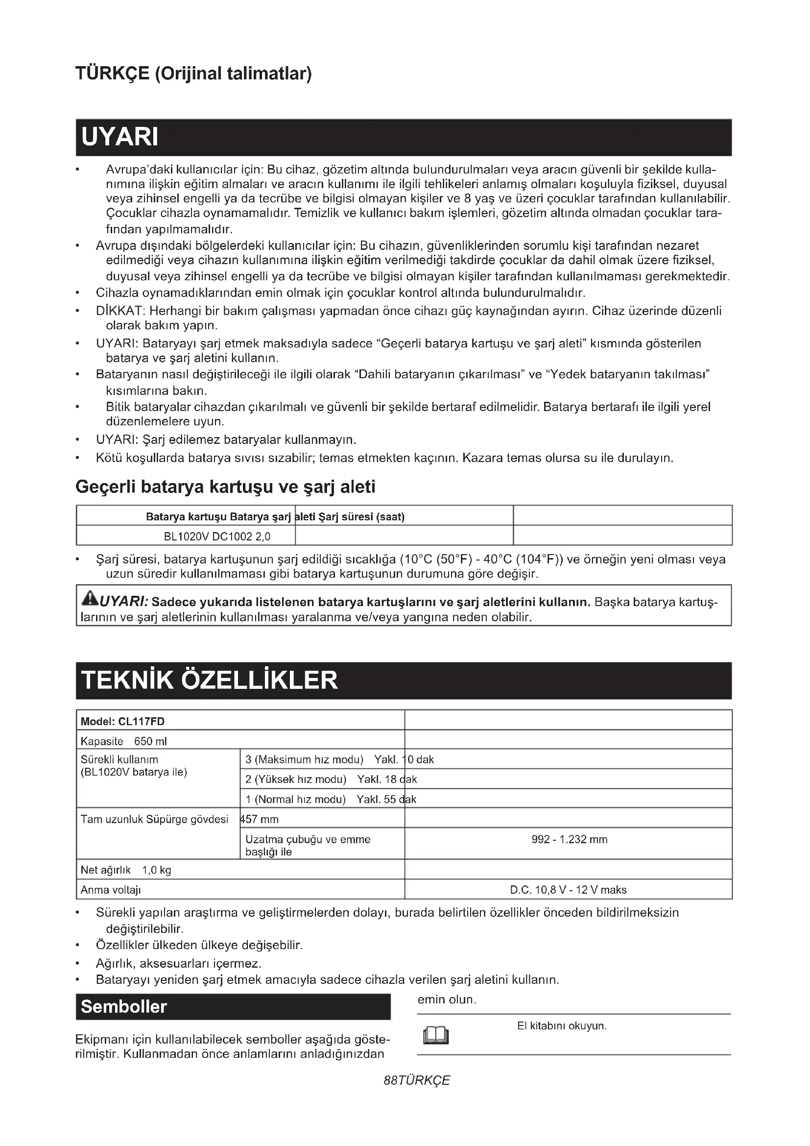 Model: CL117FD Kapasite 650 ml Süreklikullanım (BL1020Vbataryaile) 3(Maksimumhızmodu) Yakl. 10 dak 2(Yüksekhızmodu) Yakl. 18 dak 1(Normalhızmodu) Yakl. 55 dak Tam uzunluk Süpürgegövdesi 457 mm Uzatmaçubuğuveemme başlığıile