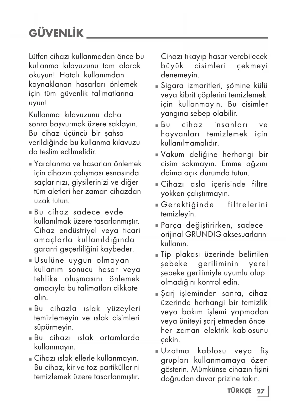GRUNDIG Küçük Ev Aletleri, geçerli güvenlik standartlarına uygundur; bundan dolayı, herhangi bir tehlikeyi önlemek için, cihaz veya elektrik kablosu hasar gördüğünde satıcı, servis merkezi veya benzeri bir uzmanlığa ve yetkiye sahip bir servis yetkilisi tarafından değiştirilmelidir. Hatalı veya yeterli olmayan onarım işlemleri, kullanıcıya yönelik tehlike ve riskler meydana getirebilir.