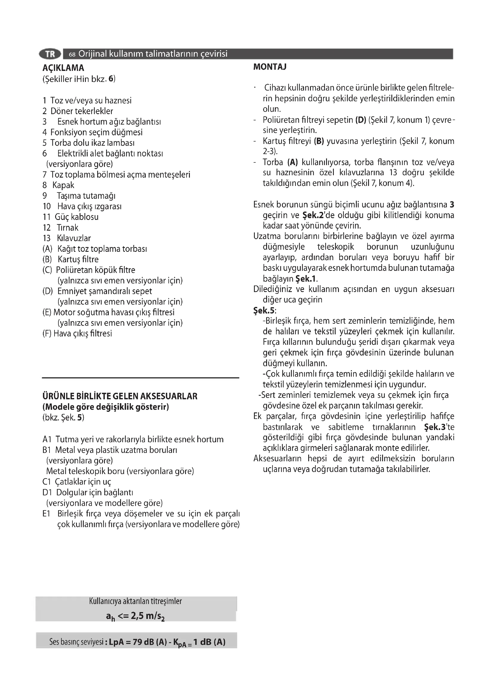 sine yerleştirin. - Kartuş filtreyi (B) yuvasına yerleştirin (Şekil 7, konum 2-3). - Torba (A) kullanılıyorsa, torba flanşının toz ve/veya su haznesinin özel kılavuzlarına 13 doğru şekilde takıldığından emin olun (Şekil 7, konum 4). Esnek borunun süngü biçimli ucunu ağız bağlantısına 3 geçirin ve Şek.2'de olduğu gibi kilitlendiği konuma kadar saat yönünde çevirin. Uzatma borularını birbirlerine bağlayın ve özel ayırma düğmesiyle teleskopik borunun uzunluğunu ayarlayıp, ardından boruları veya boruyu hafif bir baskı uygulayarak esnek hortumda bulunan tutamağa bağlayın Şek.1. Dilediğiniz ve kullanım açısından en uygun aksesuarı diğer uca geçirin Şek.5: -Birleşik fırça, hem sert zeminlerin temizliğinde, hem de halıları ve tekstil yüzeyleri çekmek için kullanılır. Fırça kıllarının bulunduğu şeridi dışarı çıkarmak veya geri çekmek için fırça gövdesinin üzerinde bulunan düğmeyi kullanın. -Çok kullanımlı fırça temin edildiği şekilde halıların ve tekstil yüzeylerin temizlenmesi için uygundur. -Sert zeminleri temizlemek veya su çekmek için fırça gövdesine özel ek parçanın takılması gerekir. Ek parçalar, fırça gövdesinin içine yerleştirilip hafifçe bastırılarak ve sabitleme tırnaklarının Şek.3'te gösterildiği gibi fırça gövdesinde bulunan yandaki açıklıklara girmeleri sağlanarak monte edilirler. Aksesuarların hepsi de ayırt edilmeksizin boruların uçlarına veya doğrudan tutamağa takılabilirler. Ses basınç seviyesi : LpA = 79 dB (A) - K pA = 1 dB (A) Kullanıcıya aktarılan titreşimler