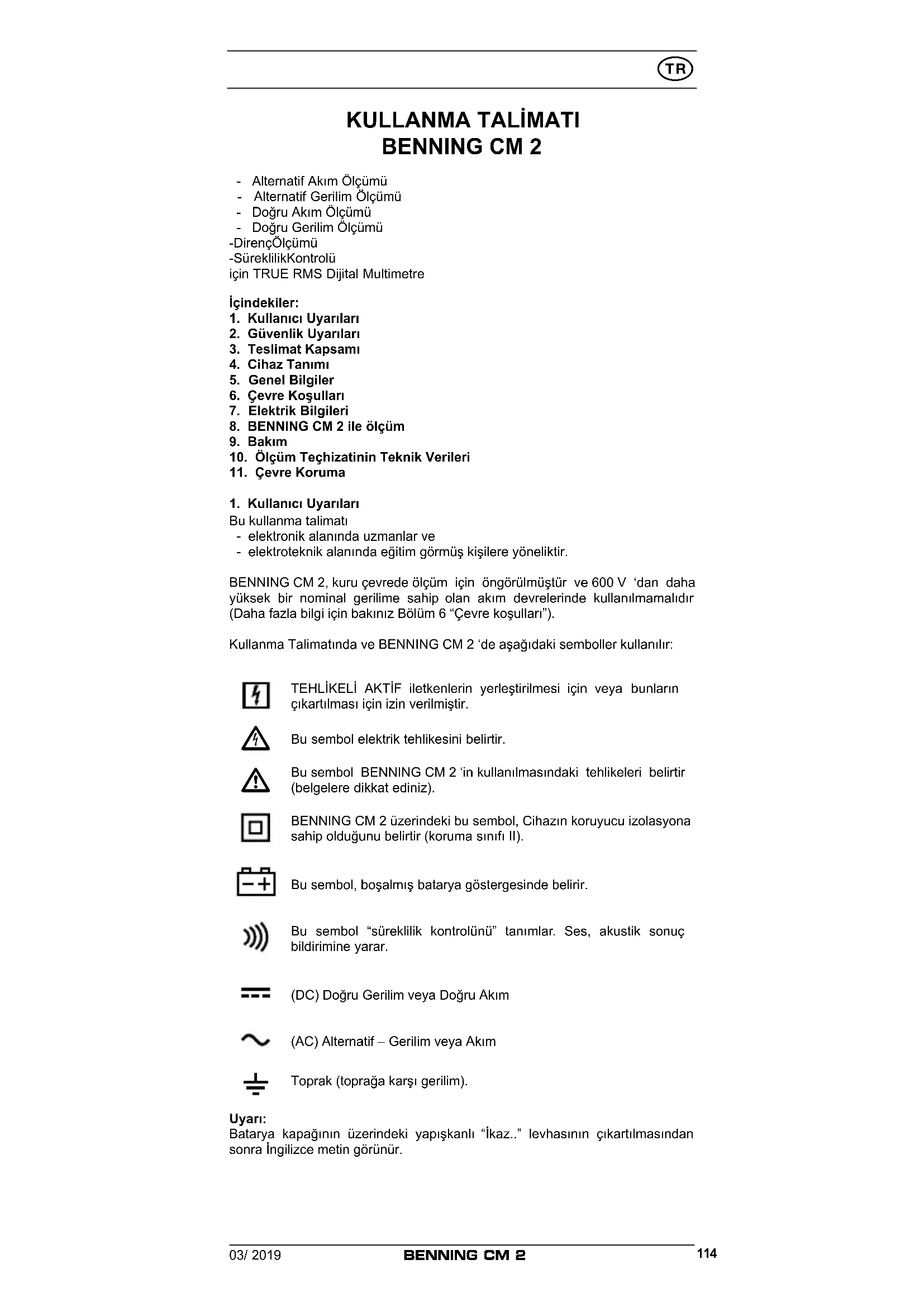 Toprak (toprağa karşı gerilim). Uyarı: Batarya kapağının üzerindeki yapışkanlı “İkaz..” levhasının çıkartılmasından sonra İngilizce metin görünür.03/ 2019 BENNING CM 2