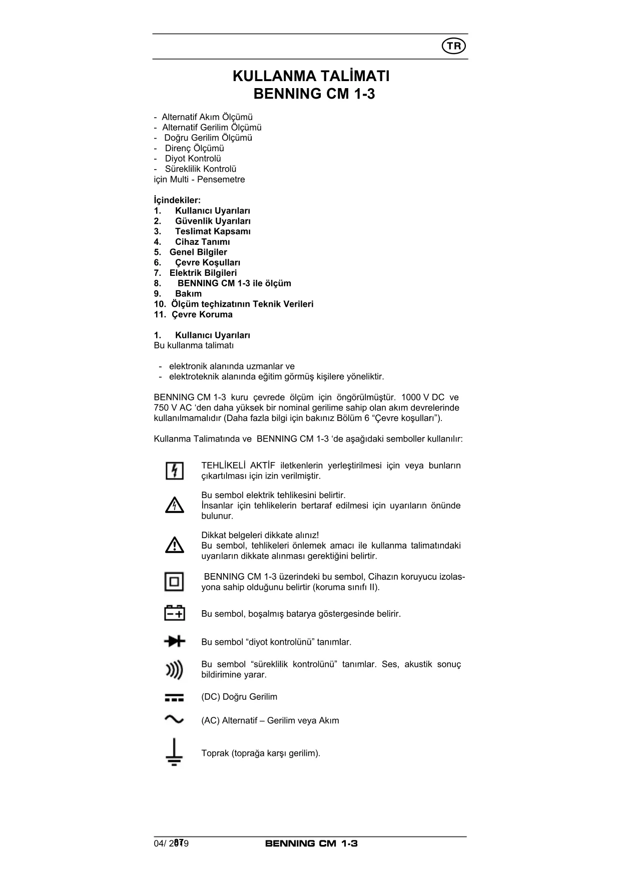 Dikkat belgeleri dikkate alınız! Bu sembol, tehlikeleri önlemek amacı ile kullanma talimatındaki uyarıların dikkate alınması gerektiğini belirtir. BENNING CM 1-3 üzerindeki bu sembol, Cihazın koruyucu izolas- yona sahip olduğunu belirtir (koruma sınıfı II). Bu sembol, boşalmış batarya göstergesinde belirir. Bu sembol “diyot kontrolünü” tanımlar. Bu sembol “süreklilik kontrolünü” tanımlar. Ses, akustik sonuç bildirimine yarar. (DC) Doğru Gerilim (AC) Alternatif – Gerilim veya Akım Toprak (toprağa karşı gerilim).04/ 2019
