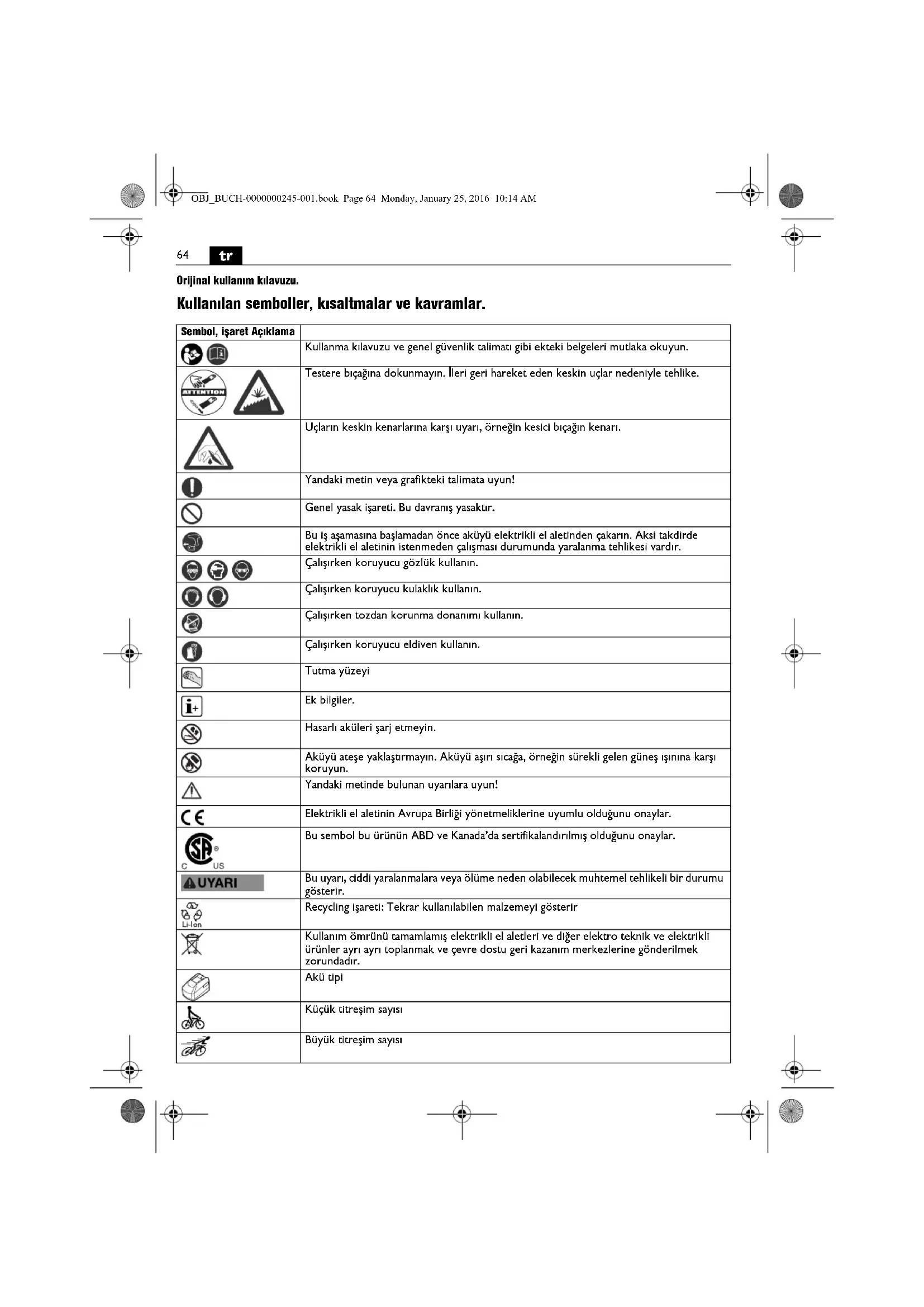 Orijinal kullanım kılavuzu. Kullanılan semboller, kısaltmalar ve kavramlar. Sembol, işaret Açıklama Kullanma kılavuzu ve genel güvenlik talimatı gibi ekteki belgeleri mutlaka okuyun. Testere bıçağına dokunmayın. İleri geri hareket eden keskin uçlar nedeniyle tehlike. Uçların keskin kenarlarına karşı uyarı, örneğin kesici bıçağın kenarı. Yandaki metin veya grafikteki talimata uyun! Genel yasak işareti. Bu davranış yasaktır. Bu iş aşamasına başlamadan önce aküyü elektrikli el aletinden çakarın. Aksi takdirde elektrikli el aletinin istenmeden çalışması durumunda yaralanma tehlikesi vardır. Çalışırken koruyucu gözlük kullanın. Çalışırken koruyucu kulaklık kullanın. Çalışırken tozdan korunma donanımı kullanın. Çalışırken koruyucu eldiven kullanın. Tutma yüzeyi Ek bilgiler. Hasarlı aküleri şarj etmeyin. Aküyü ateşe yaklaştırmayın. Aküyü aşırı sıcağa, örneğin sürekli gelen güneş ışınına karşı koruyun. Yandaki metinde bulunan uyarılara uyun! Elektrikli el aletinin Avrupa Birliği yönetmeliklerine uyumlu olduğunu onaylar. Bu sembol bu ürünün ABD ve Kanada’da sertifikalandırılmış olduğunu onaylar. Bu uyarı, ciddi yaralanmalara veya ölüme neden olabilecek muhtemel tehlikeli bir durumu gösterir. Recycling işareti: Tekrar kullanılabilen malzemeyi gösterir Kullanım ömrünü tamamlamış elektrikli el aletleri ve diğer elektro teknik ve elektrikli ürünler ayrı ayrı toplanmak ve çevre dostu geri kazanım merkezlerine gönderilmek zorundadır. Akü tipi Küçük titreşim sayısı Büyük titreşim sayısı OBJ_BUCH-0000000245-001.book Page 64 Monday, January 25, 2016 10:14 AM65